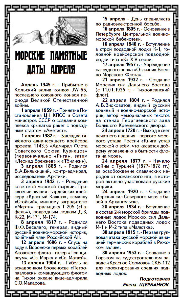 Морские памятные даты апреля ("Боевая вахта" 30.03.2013). |