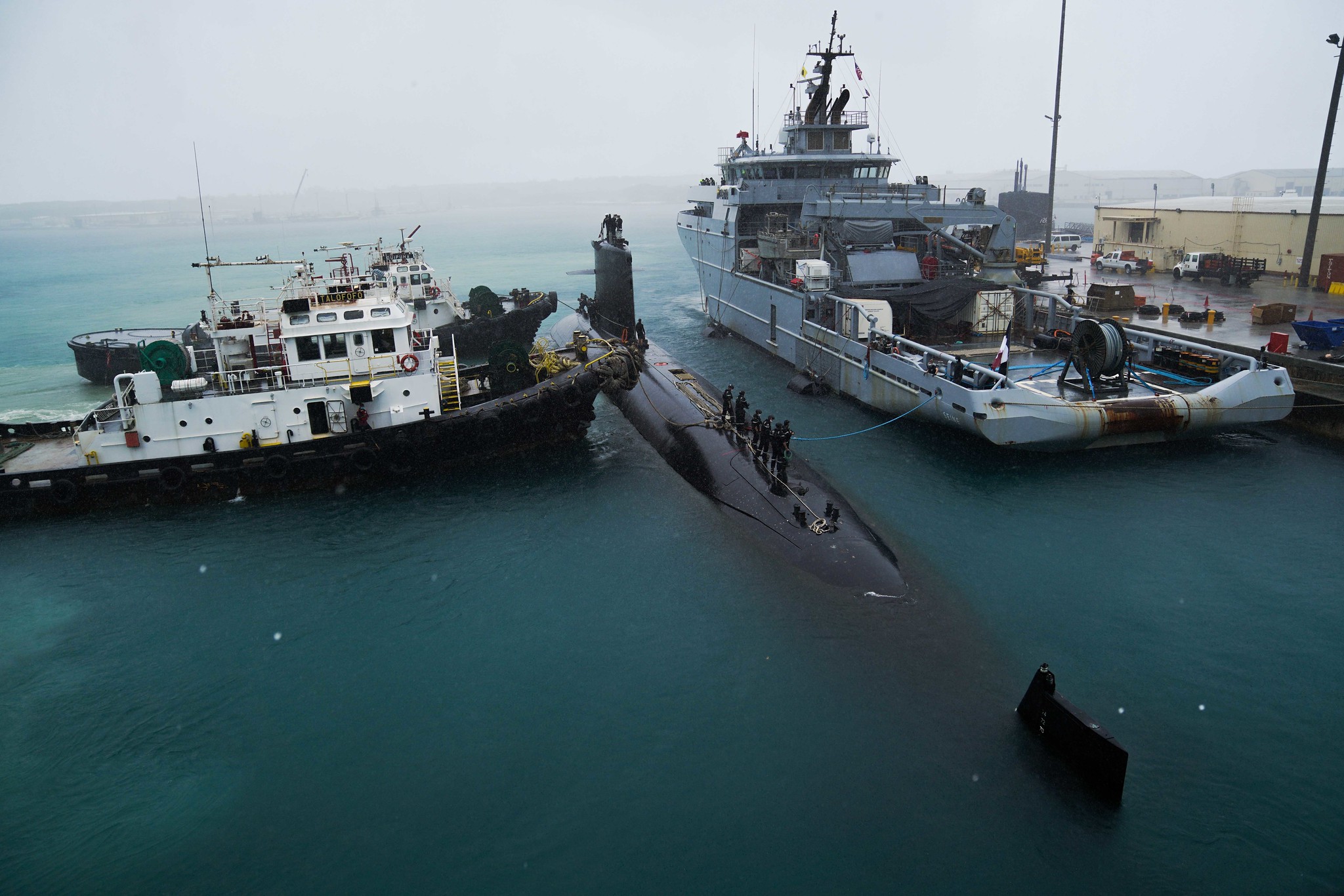 САНТА-РИТА, Гуам (30 ноября 2020 г.) Военно-морская база, буксирные катера помогают во время швартовки ударной подводной лодки класса Rubis FS Émeraude (S-604) французского флота к тендерному судну класса Loire и судну обеспечения FS Seine (A- 604) на военно-морской базе США Гуам (NBG). Эмерод и Сена в настоящее время находятся в порту NBG в рамках долгосрочного развертывания (U.S. Navy photo by Mass Communication Specialist 2nd class Kelsey J. Hockenberger) 201130-N-VR594-1108 (Official U.S. Navy Page).