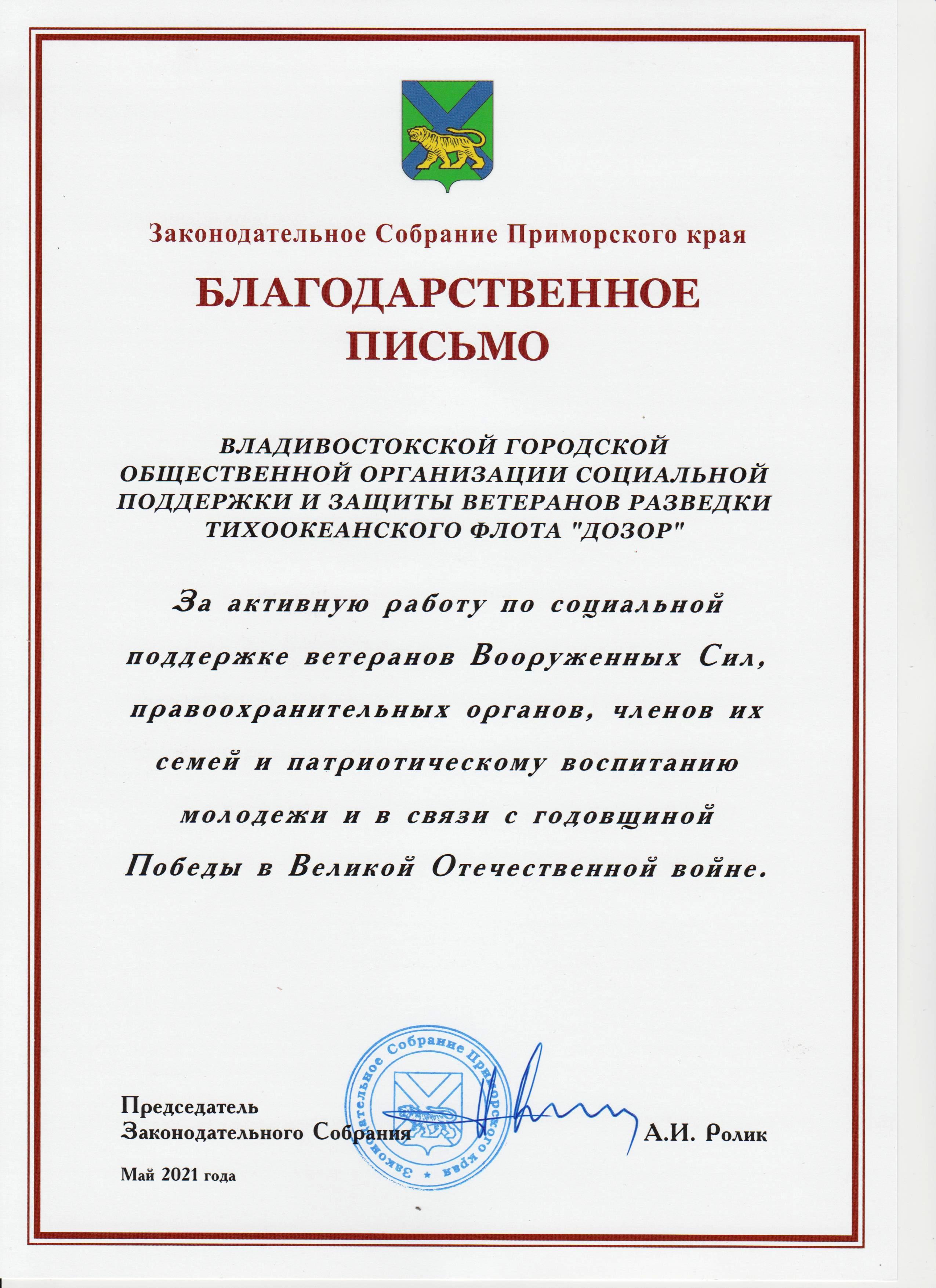 7 мая на торжественном собрании общественности г. Владивостока Председателю Совета ветеранов разведки ТОФ контр-адмиралу в отставке Козловскому Вячеславу Владимировичу было вручено Благодарственное письмо!