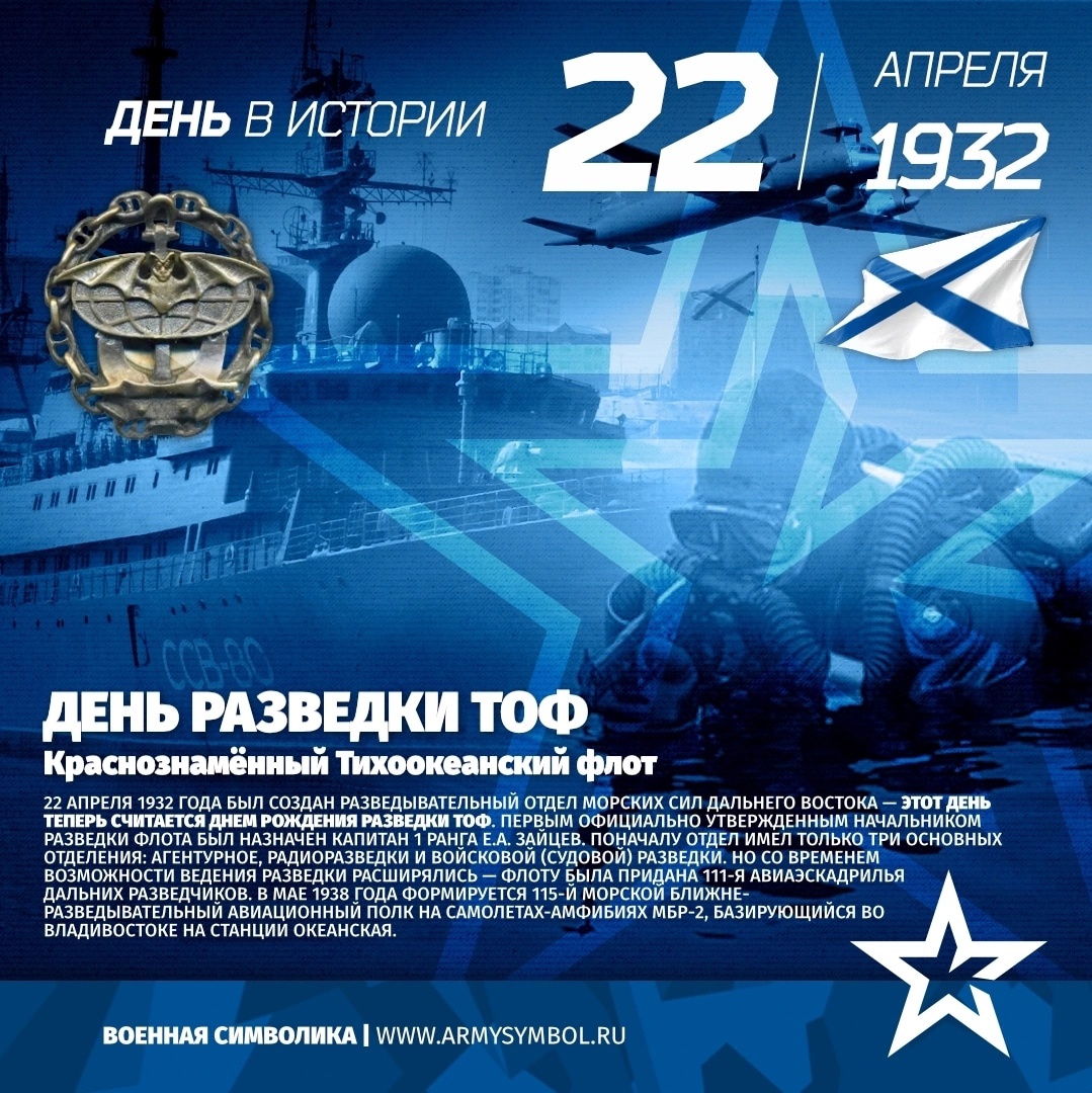 21 апреля 1932 года приняли решение о создании Морских сил Дальнего Востока под командованием флагмана флота 1 ранга М.В. Викторова. День 21 апреля 1932 года считается днем создания Советского Тихоокеанского флота. А на следующий день был создан разведывательный отдел Морских сил Дальнего Востока — этот день теперь считается днем рождения разведки ТОФ. Первым официально утвержденным начальником разведки флота был назначен капитан 1 ранга Е.А. Зайцев.