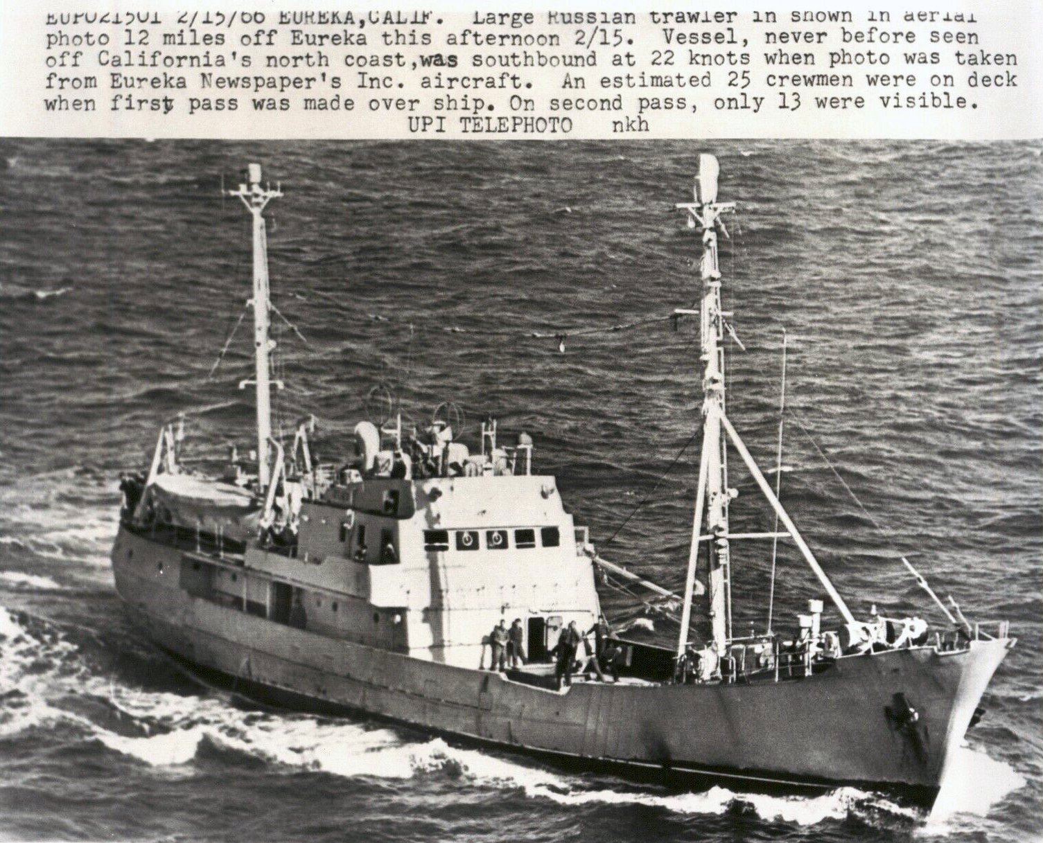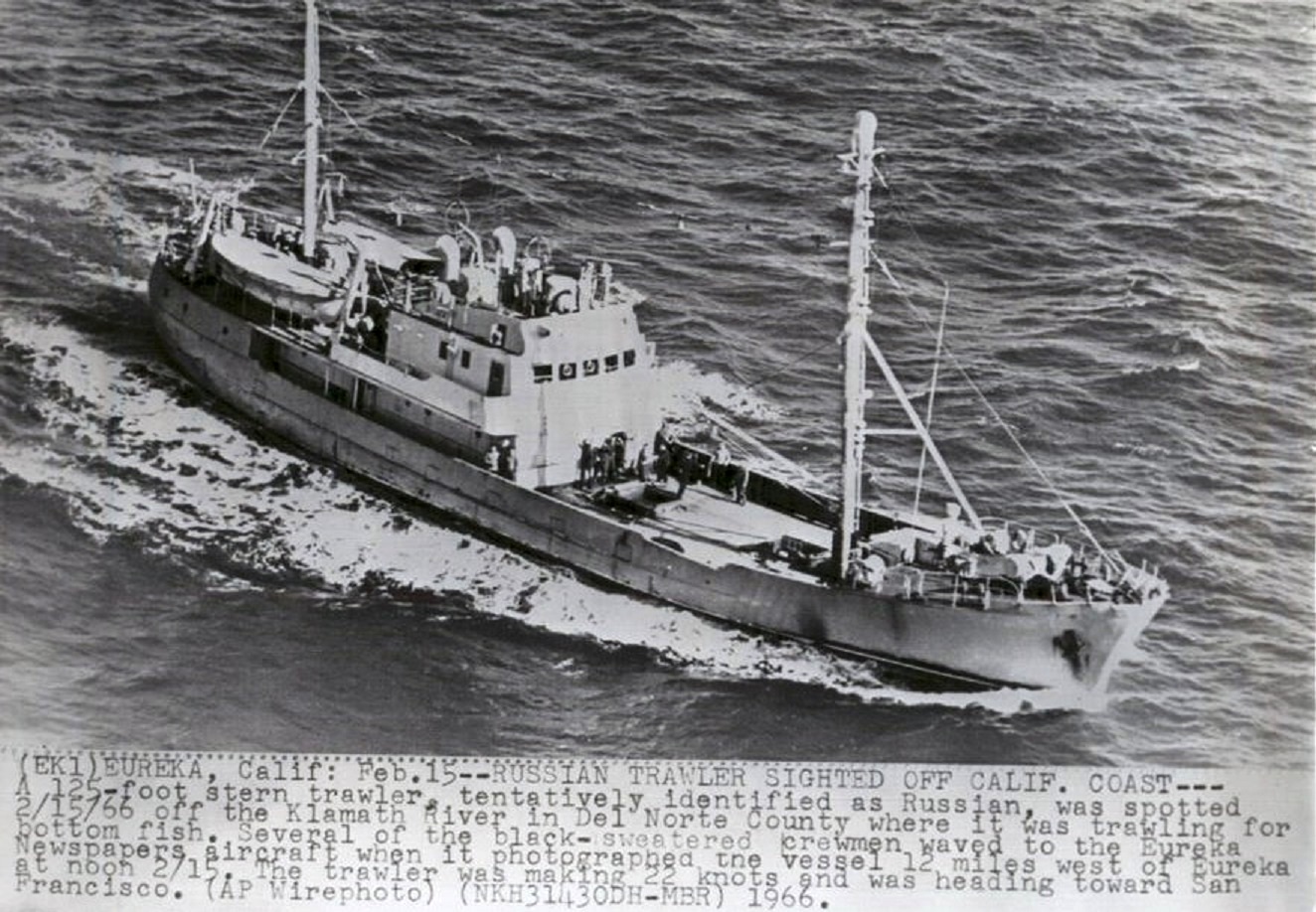"Датируется 1965-02-23, РЗК "Арбан" (будущий "Пеленг") в районе побережья Калифорнии следит за участниками учения "Silver Lance". Фото продается на e-bay, закрыто копирайтом..." (Разведывательные корабли ВМФ(2), OldSeaman).