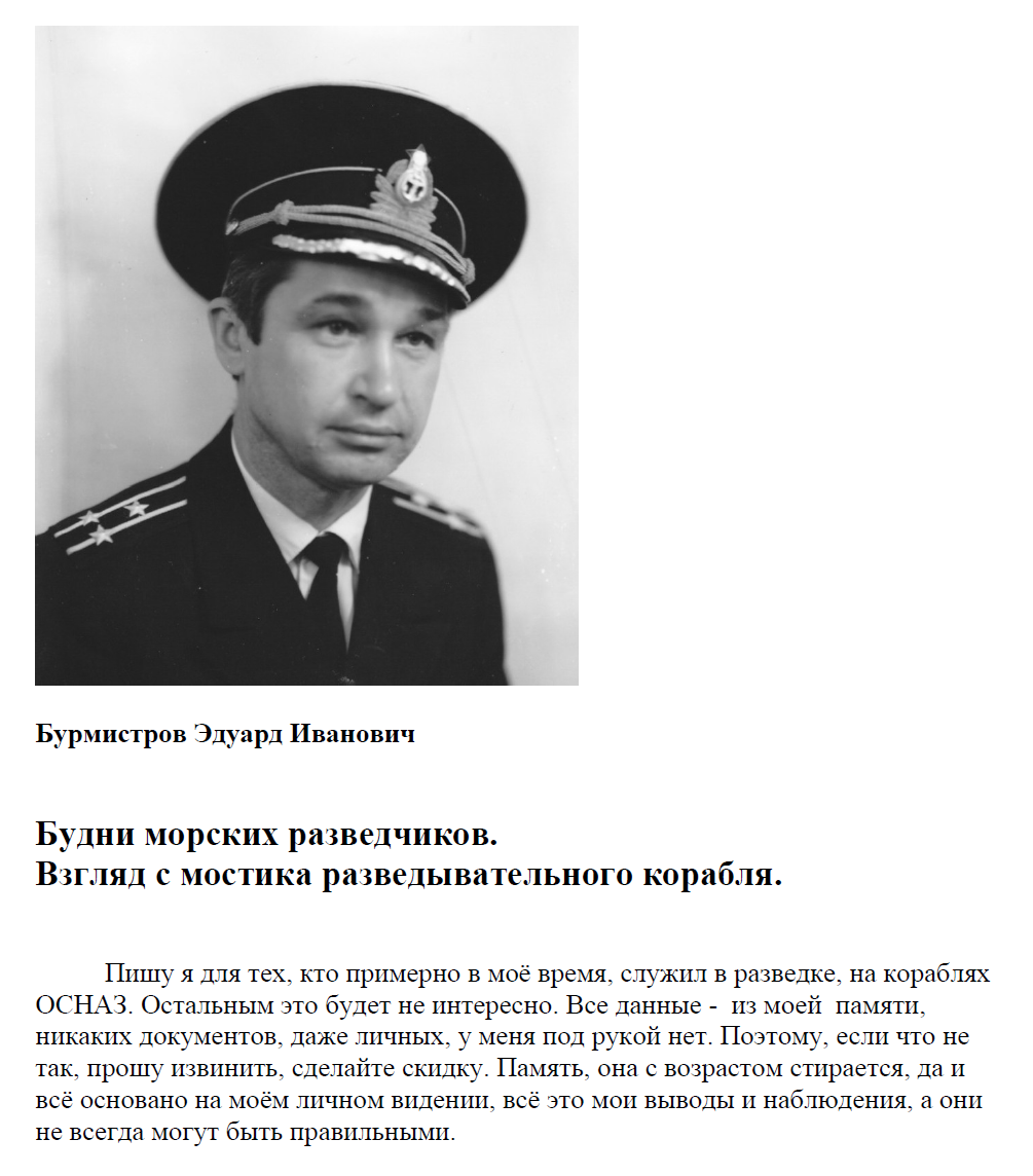 Капитан 1 ранга в/о Бурмистров Эдуард Иванович -"Будни морских разведчиков. Взгляд с мостика разведывательного корабля."