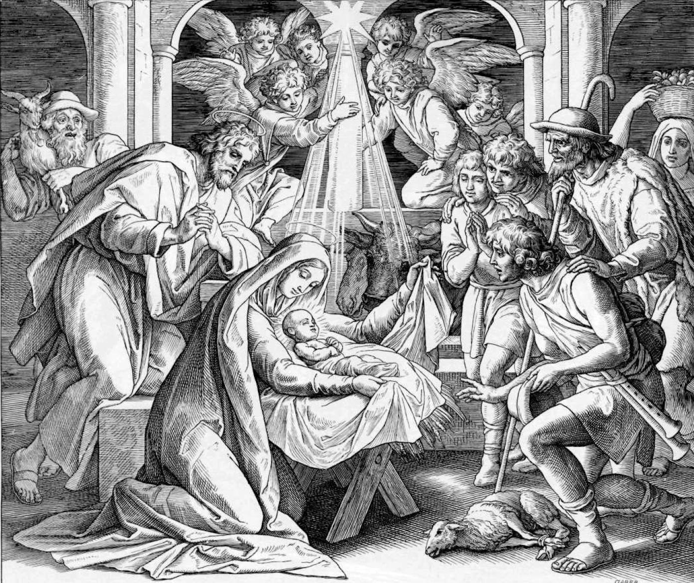 «В те дни вышло от кесаря Августа повеление сделать перепись по всей земле. Эта перепись была первая в правление Квириния Сириею. И пошли все записываться, каждый в свой город. Пошел также и Иосиф из Галилеи, из города Назарета, в Иудею, в город Давидов, называемый Вифлеем, потому что он был из дома ирода Давидова, записаться с Мариею, обрученною ему женою, которая была беременна. Когда же они были там, наступило время родить Ей; и родила Сына своего Первенца, и спеленала Его, и положила Его в ясли, потому что не было им места в гостинице. В той стране были на поле пастухи, которые содержали ночную стражу у стада своего. Вдруг предстал им Ангел Господень, и слава Господня осияла их; и убоялись страхом великим. И сказал им Ангел: не бойтесь; я возвещаю вам великую радость, которая будет всем людям: ибо ныне родился вам в городе Давидовом Спаситель, Который есть Христос Господь; и вот вам знак: вы найдете Младенца в пеленах, лежащего в яслях. И внезапно явилось с Ангелом многочисленное воинство небесное, славящее Бога и взывающее: слава в вышних Богу, и на земле мир, в человеках благоволение! Когда Ангелы отошли от них на небо, пастухи сказали друг другу: пойдем в Вифлеем и посмотрим, что там случилось, о чем возвестил нам Господь. И, поспешив, пришли и нашли Марию и Иосифа, и Младенца, лежащего в яслях…» Евангелие от Луки 2:15-16