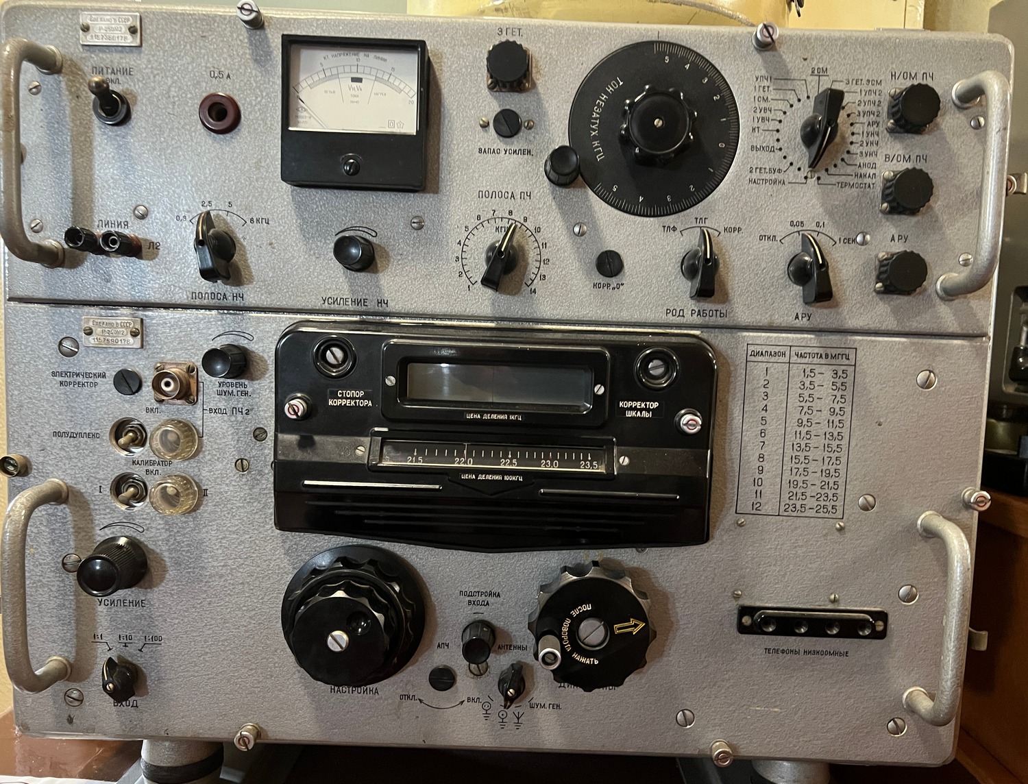 Коротковолновый радиоприемник Р-250М2. "Р-250/М/М2 (Р-670/М) - легендарный, любимый многими радиолюбителями, коротковолновый, ламповый, магистральный, настольный армейский радиоприемник. Выпускался c 1948 по 1981 г. в нескольких модификациях: "Р-250/М/М2" ("Кит/М/М2") - для сухопутных войск; "Р-670/М" ("Русалка/М") - для войск военно-морского флота. Применялся для встраивания в стойки "КМПУ/М" и "Краб/М". Отличался высокой чувствительностью, отличной динамикой и стабильностью работы. Число ламп: 19. Разработчики приемника: Антон Антонович Савельев, Юрий Александров (U1SX) и др. Вначале конструкция называлась "АС-1", позднее в модификациях конструкции цифра "1" была заменена на "2" и приемник стал называться "АС-2" (по инициалам автора). Радиоприемник получил Сталинскую премию в 1950 годы..."