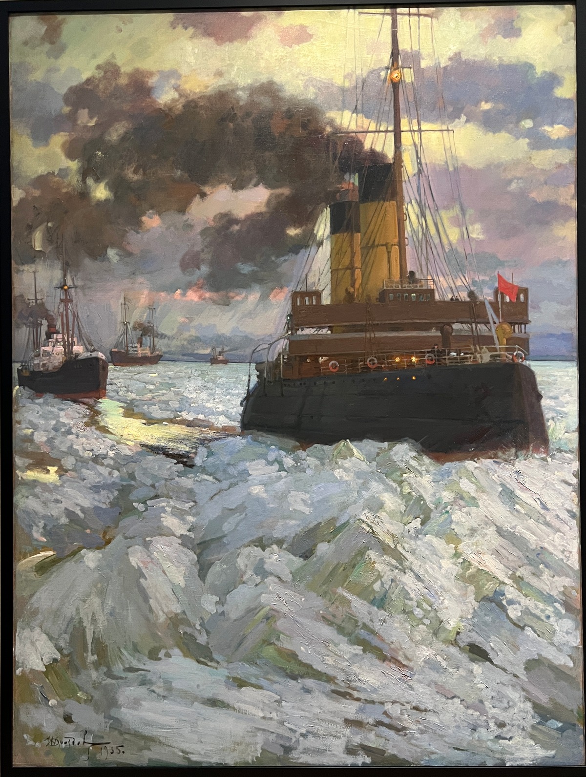 Дроздов И.Г. (1880-1939). Ледокол "Ермак" проводит караван судов. Левая часть триптиха "Ленинградский порт", 1935 г. 17.08.2025