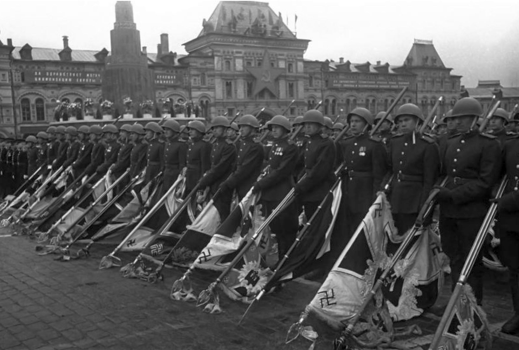 Москва 24.06.1945 год, Парад Победы. Советские солдаты с поверженными штандартами гитлеровских войск. Автор