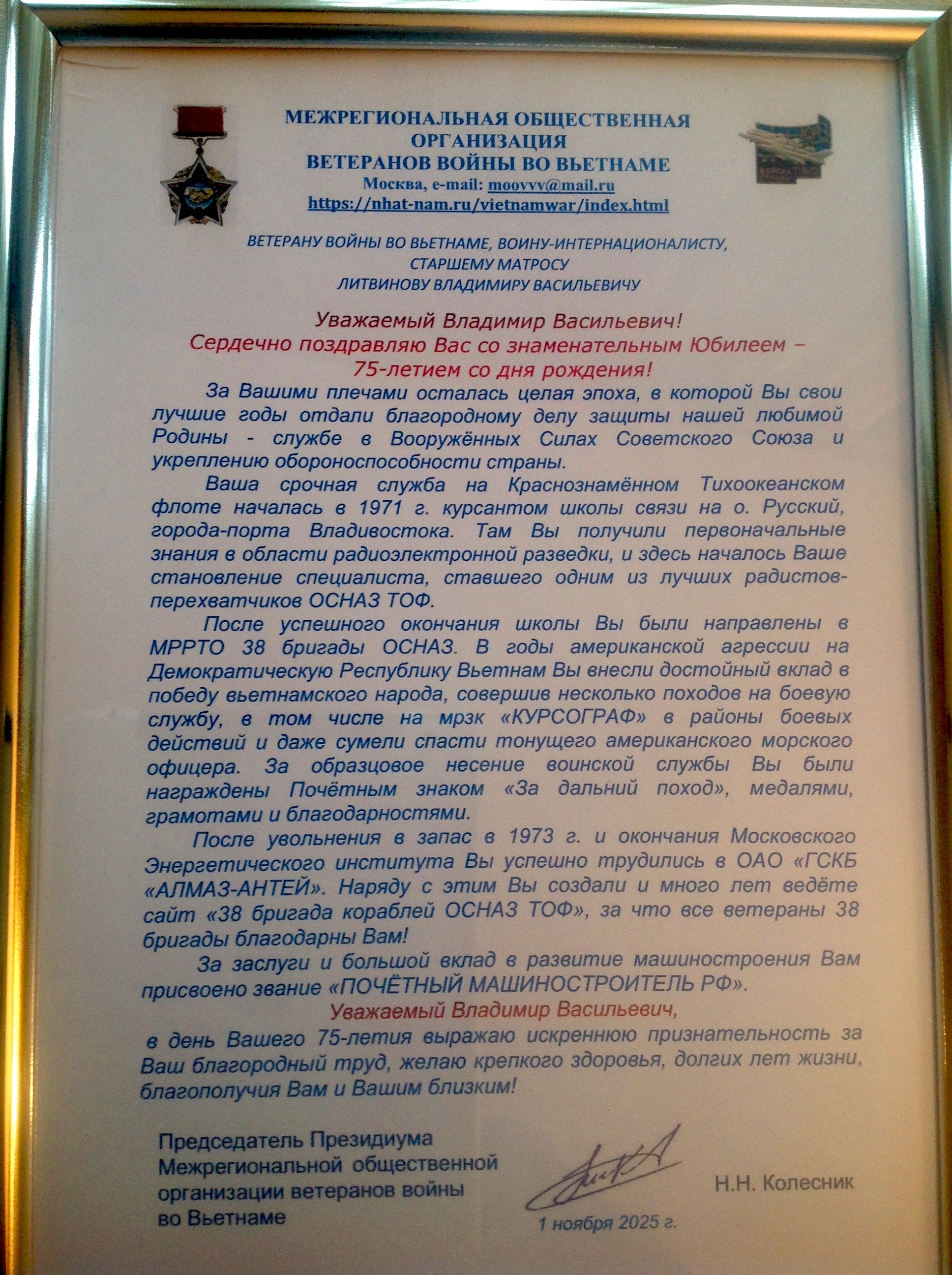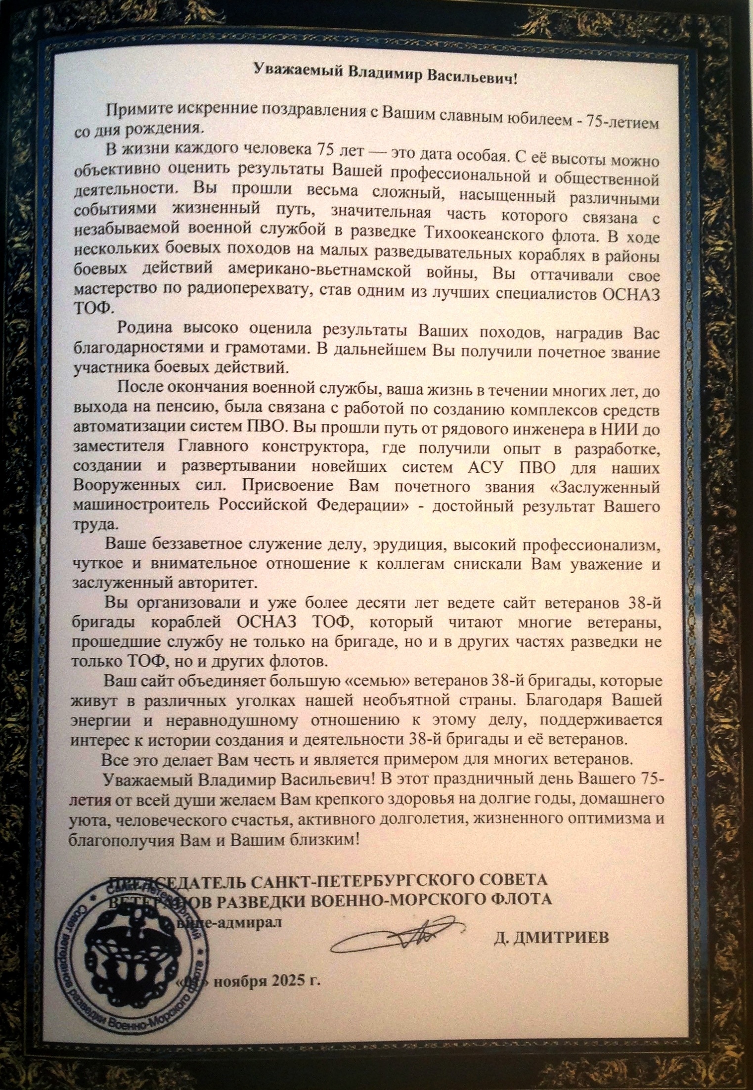 Сегодня исполняется 75 лет Литвинову Владимиру Васильевичу, проходившему срочную службу на Тихоокеанском флоте с 1970 по 1973 гг. в 19 МРРТО, по специальности – радиотелеграфист ОСНАЗ (ВУС-382). Уважаемый Владимир Васильевич! В этот прекрасный день я по поручению группы ветеранов 38 бригады кораблей ОСНАЗ ТОФ искренне и сердечно поздравляю тебя со славным юбилеем – 75 летием со дня рождения! Как говорят на флоте, за кормой у тебя тысячи пройденных миль на разведывательных кораблях 38 бригады, где ты на своем боевом посту, успешно и эффективно решал стоящие перед тобой задачи, свидетельством чему являются благодарности и грамоты от командования, в том числе от Главного Управления МО РФ. Во время войны во Вьетнаме в составе экипажей разведывательных кораблей ты несколько раз был непосредственно в зоне боевых действий, в том числе в зоне боевых действий на минном поле в Тонкинском заливе, за что тебе было присвоено почетное звание "Ветеран боевых действий". Во время одного из походов на мрзк «Курсограф» в Южно-Китайское море, ты принимал участие в спасении американского моряка из экипажа штабного корабля "Блю Ридж" Седьмого флота ВМС США. После окончания военной службы, ты много лет трудился на одном из предприятий оборонной промышленности, пройдя путь от рядового инженера до заместителя Главного конструктора. За трудовые успехи тебе присвоили почетное звание «Заслуженный машиностроитель Российской Федерации». Я хотел бы в этот Юбилейный день выразить тебе благодарность и признательность как администратору сайта 38brrzk.ru, создателем и бессменным руководителем которого ты являешься. Безусловно, большую помощь в этом оказал тебе наш комбриг Лукаш Д.Т., который предоставил для размещения на сайте много материалов и свои воспоминания о службе на ТОФ. Информационная поддержка сайта способствовала объединению ветеранов нашего соединения и созданию Московского Совета ветеранов 38 бригады кораблей ОСНАЗ ТОФ «37 ПРИЧАЛ». Уважаемый Владимир Васильевич! Желаем крепкого здоровья, счастья, благополучия тебе, твоей семье, родным и близким. Живи долго и счастливо! Семь футов под килем!