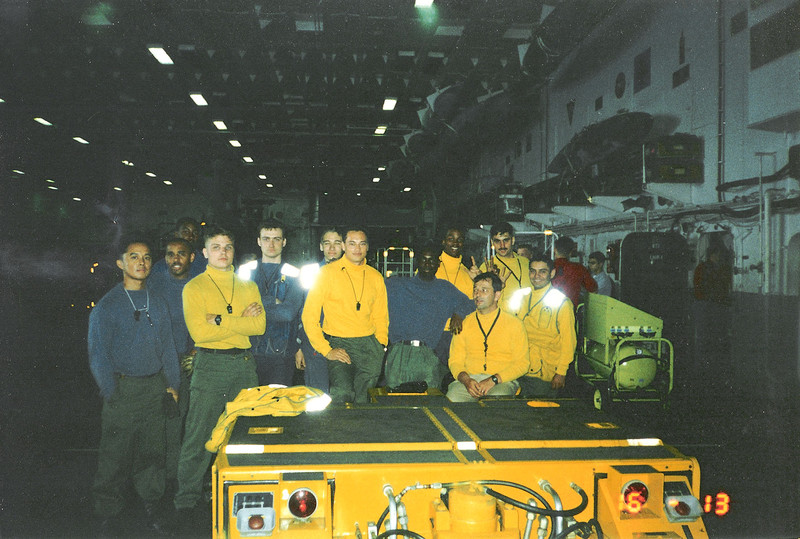 А на полетной палубе для быстрой идентификации народ носил разноцветные джемпера, так как я был в авиационной БЧ то в основном на фото народ из нашей БЧ в джемперах. Из-за общей не удобности синих джинс (они были достаточно обтягивающими и в них было неудобно нагибаться) нам разрешали покупать зеленые форменные штаны из военной формы времен Вьетнама и носить их.