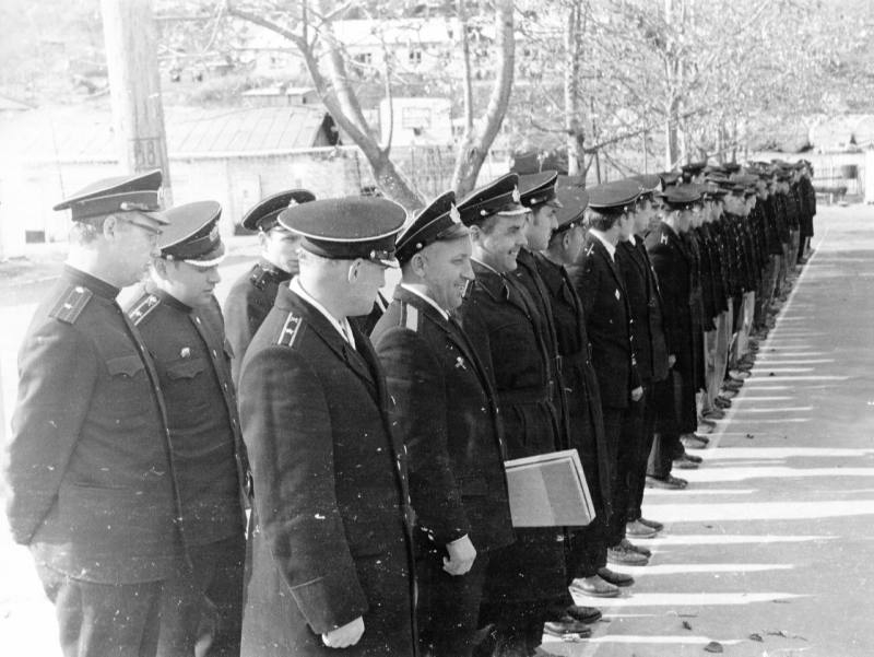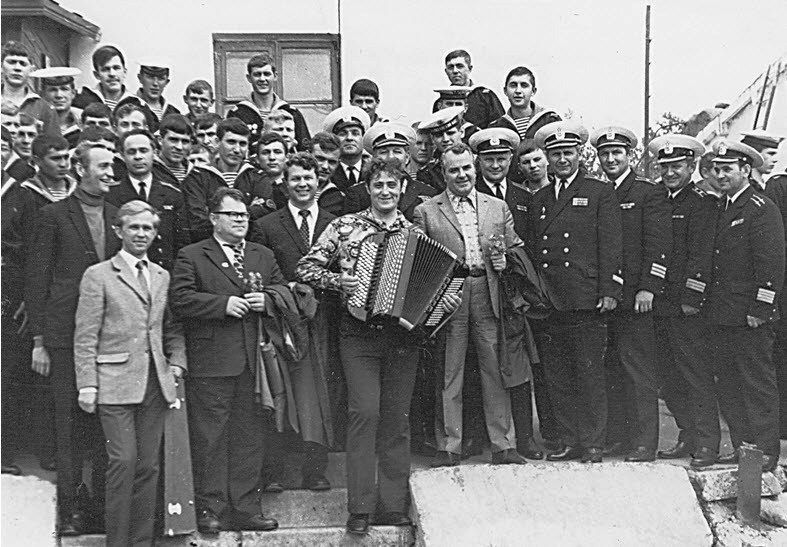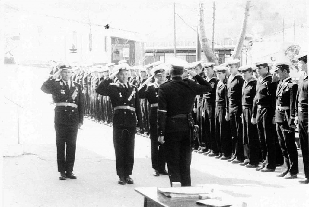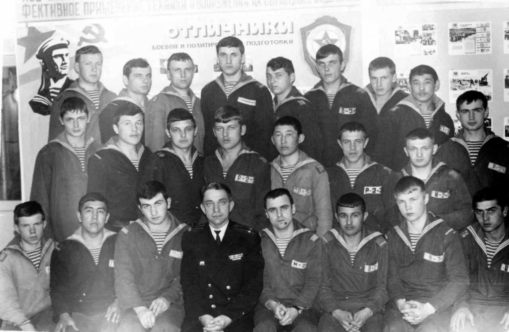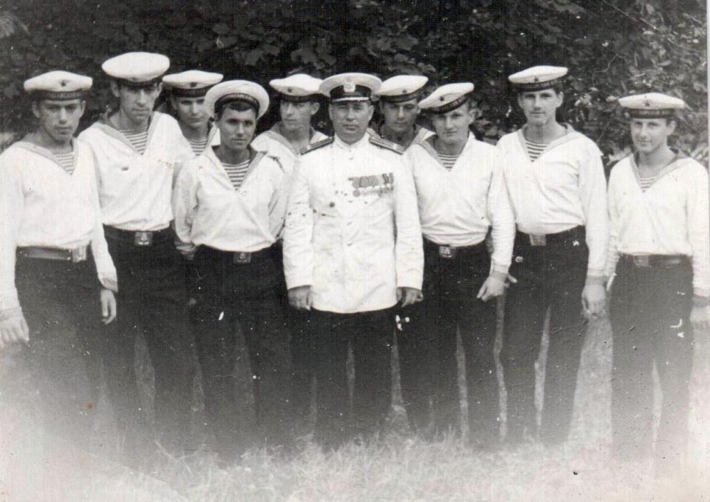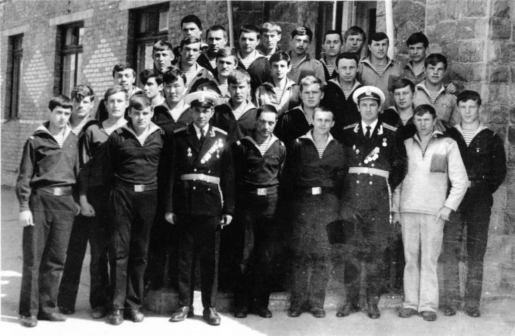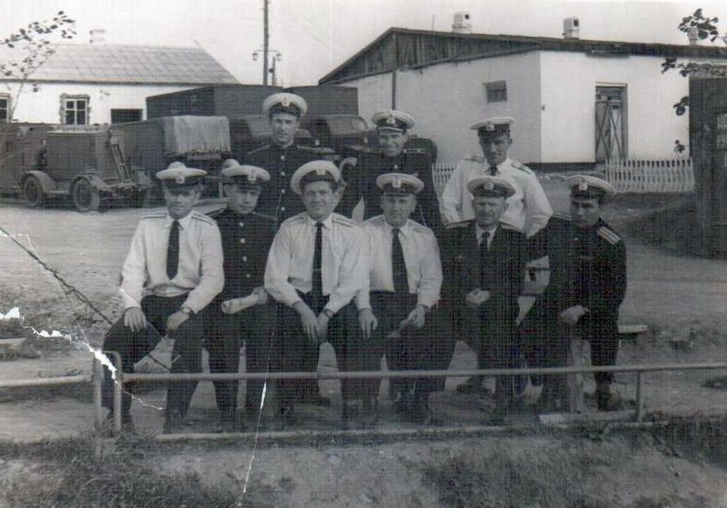 Группа офицеров и сверсрочнослужащих 19 ОМРТО. Слева направо стоят: капитан 3 ранга Клопов С.А., - нач. хим. службы, капитан 2 ранга Иванников И.И. - зам. командира по политической части, лейтенант Петрищев А.А. - помощник начальника ЦОИ - тогда Курицина Геннадия Ивановича, капитан 1 ранга Лукаш Д.Т. - командир отряда, капитан 3 ранга Щепетков В.Н. -командир подразделения, капитан 2 ранга Иванов Б.Г. - начальник штаба части, капитан 3 ранга Курицын Г.И. - начальник тех.лаборатории, капитан-лейтенант Лисицын В.И. - начальник радиотехнической мастерской, капитан 3 ранга Терехов Ю.П., мичман Петрашин Ю., мичман Прохоренко К.Л., капитан Грищенко Н.М., мичман Антоненко, 1 мая 1968 год. |