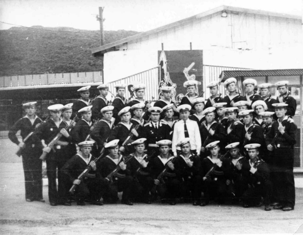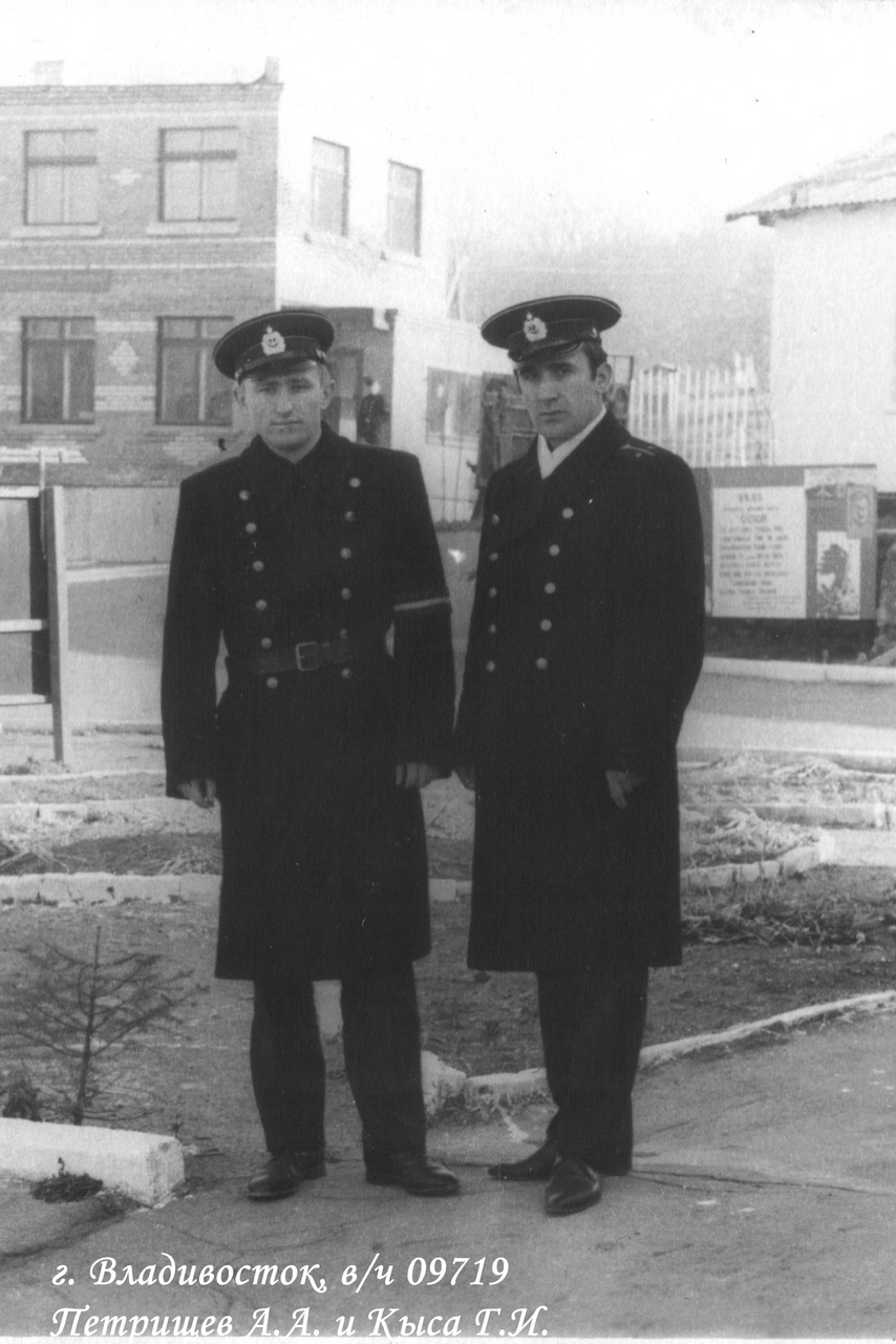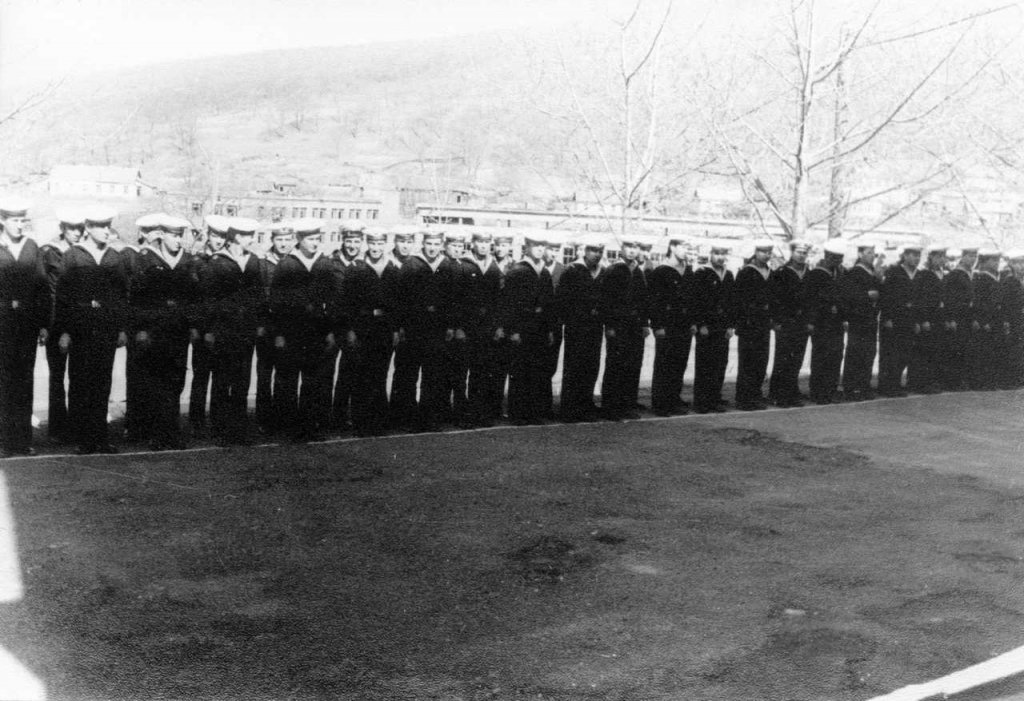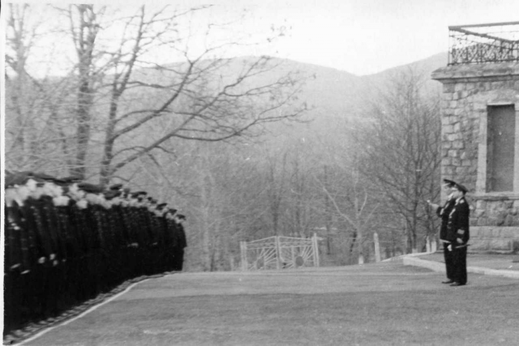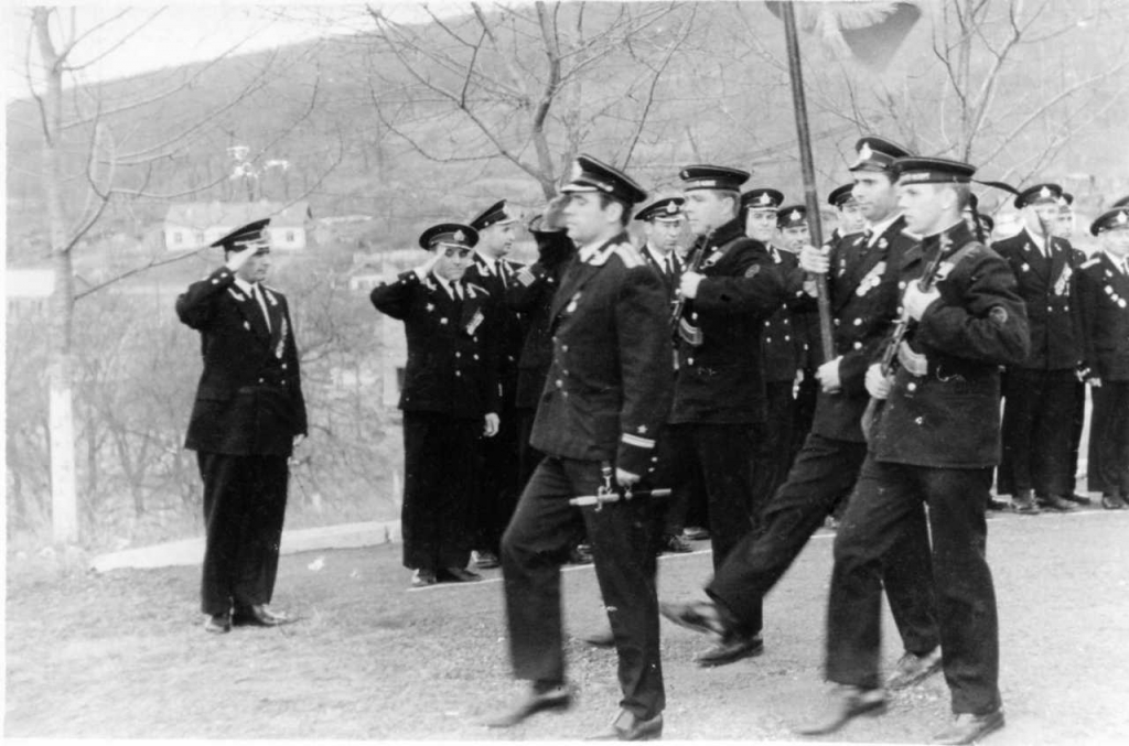Группа офицеров и сверсрочнослужащих 19 ОМРТО. Слева направо стоят: капитан 3 ранга Клопов С.А., - нач. хим. службы, капитан 2 ранга Иванников И.И. - зам. командира по политической части, лейтенант Петрищев А.А. - помощник начальника ЦОИ - тогда Курицина Геннадия Ивановича, капитан 1 ранга Лукаш Д.Т. - командир отряда, капитан 3 ранга Щепетков В.Н. -командир подразделения, капитан 2 ранга Иванов Б.Г. - начальник штаба части, капитан 3 ранга Курицын Г.И. - начальник тех.лаборатории, капитан-лейтенант Лисицын В.И. - начальник радиотехнической мастерской, капитан 3 ранга Терехов Ю.П., мичман Петрашин Ю., мичман Прохоренко К.Л., капитан Грищенко Н.М., мичман Антоненко, 1 мая 1968 год. |