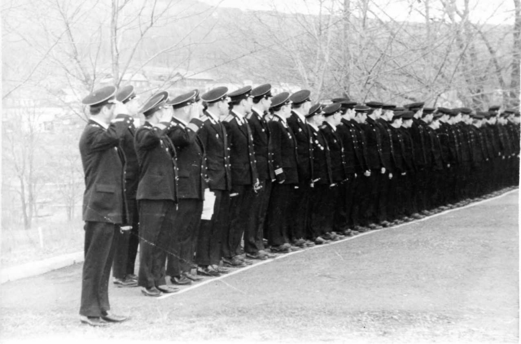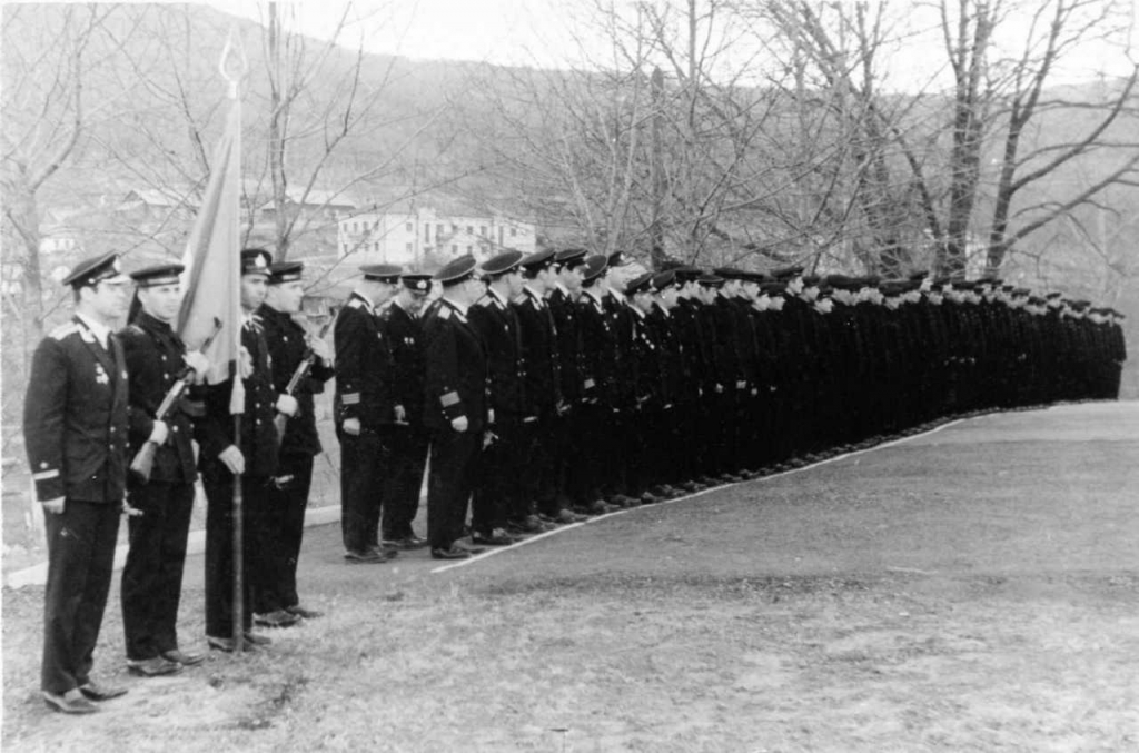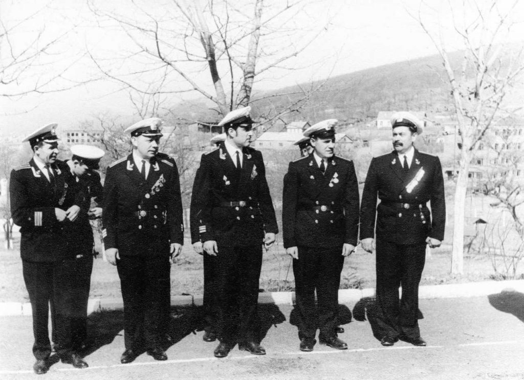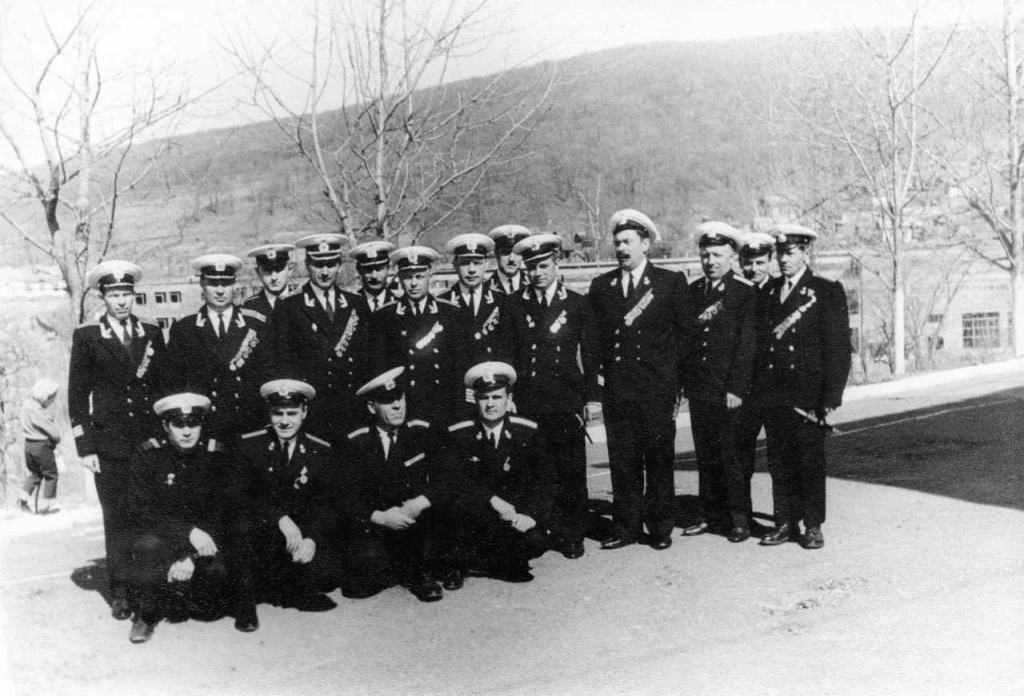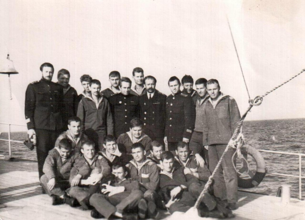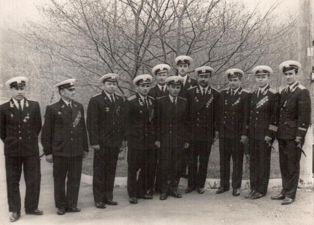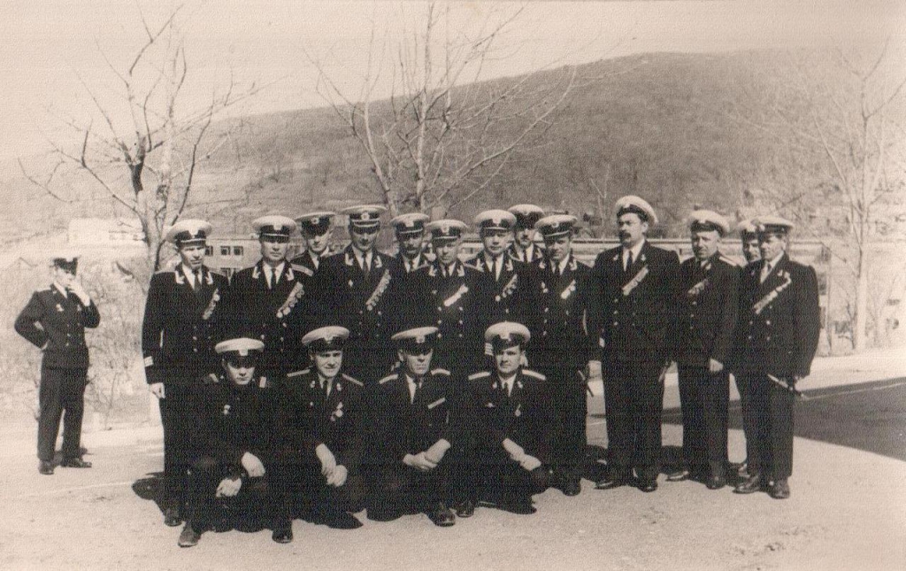 Офицеры 19 МРРТО ,в центре командир отряда капитан 3 ранга Суров Александр Ввсильевич, слева от него майор Нейштадт Л.Я., справа капитан 3 ранга Зубков Н.В., капитан 3 ранга Шаповалов Г.В., старший лейтенант Рогов О.П., второй ряд в центе мичман Горбенко, третий ряд (справа налево) капитан-лейтенант Полюшин Б.М., капитан-лейтенант Карев В.А., старший лейтенант Степанченко А.Д.1974г. |