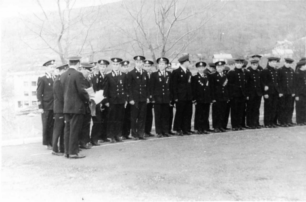 Начальник штаба отряда капитан 2 ранга Фадеев Н.П. с группой мичманов части. Слева направо: мичман Пискарёв А.В., Петрашин Ю., Володин, капитан 3 ранга Исаев В.Е., мичман Антоненко, капитан 2 ранга Фадеев Н.П., ... , мичман Афанасьев. |