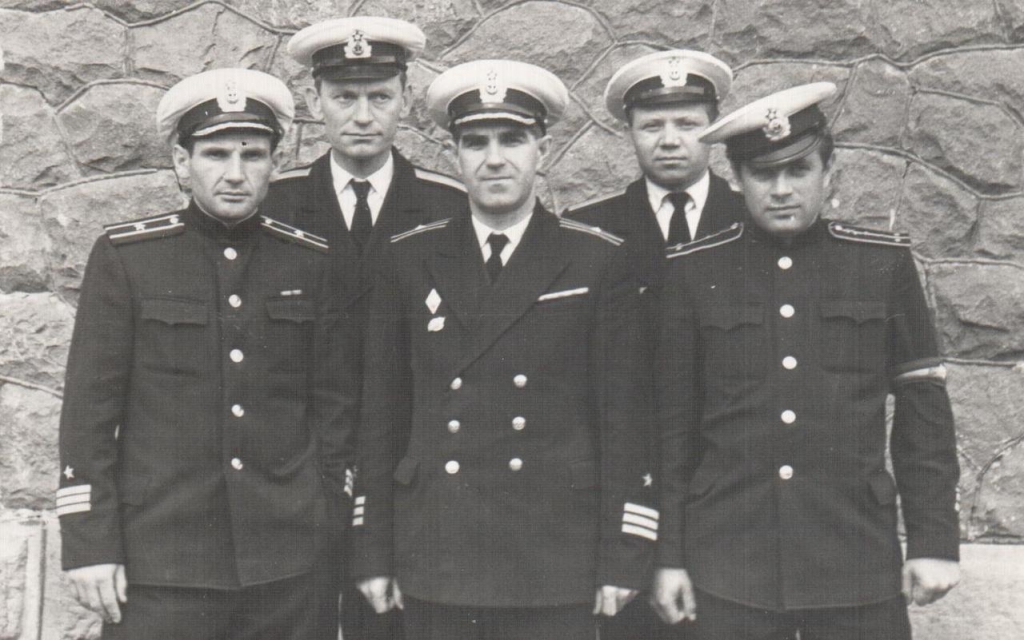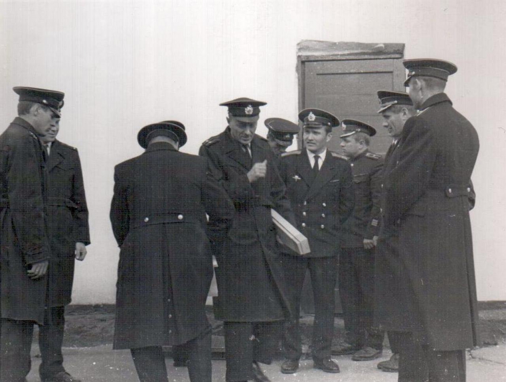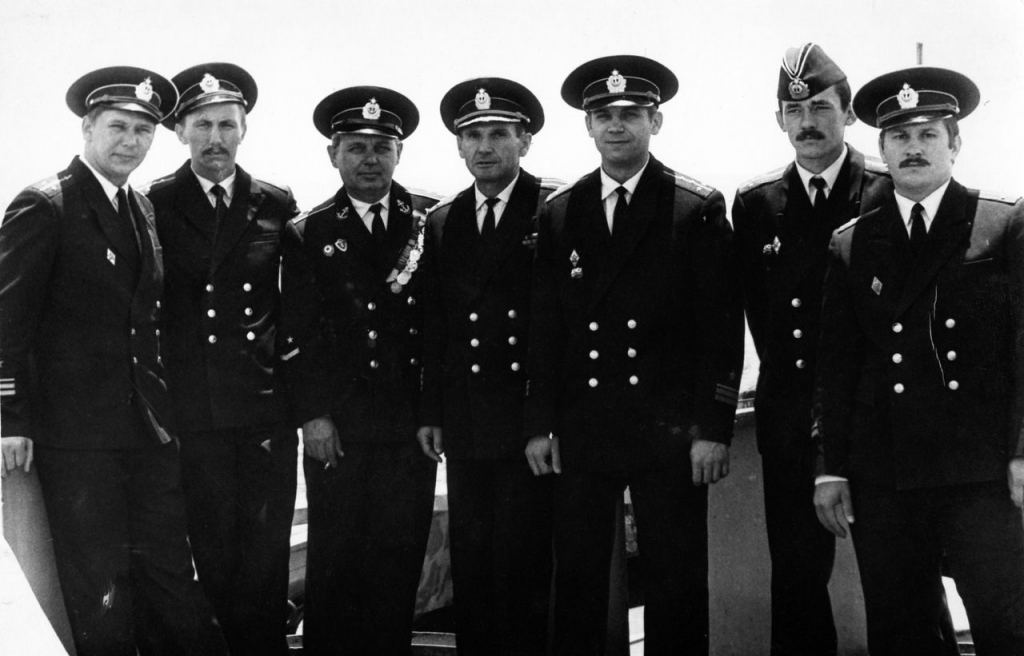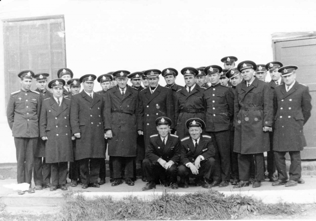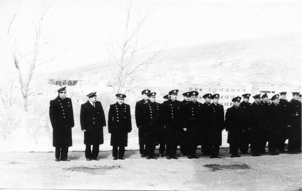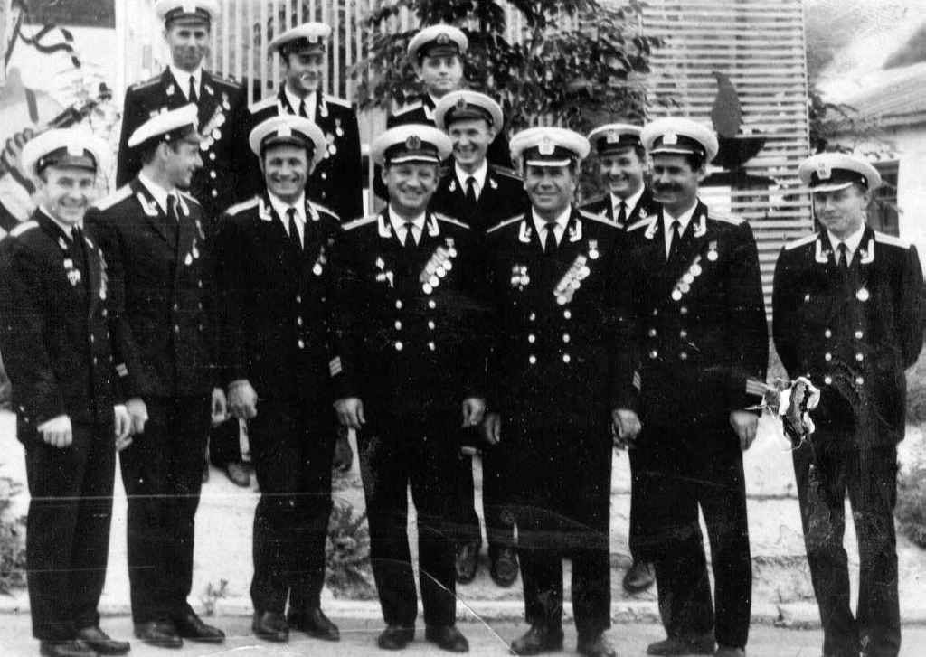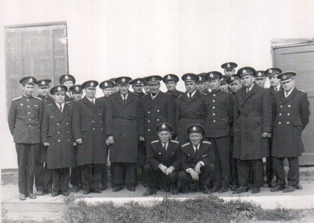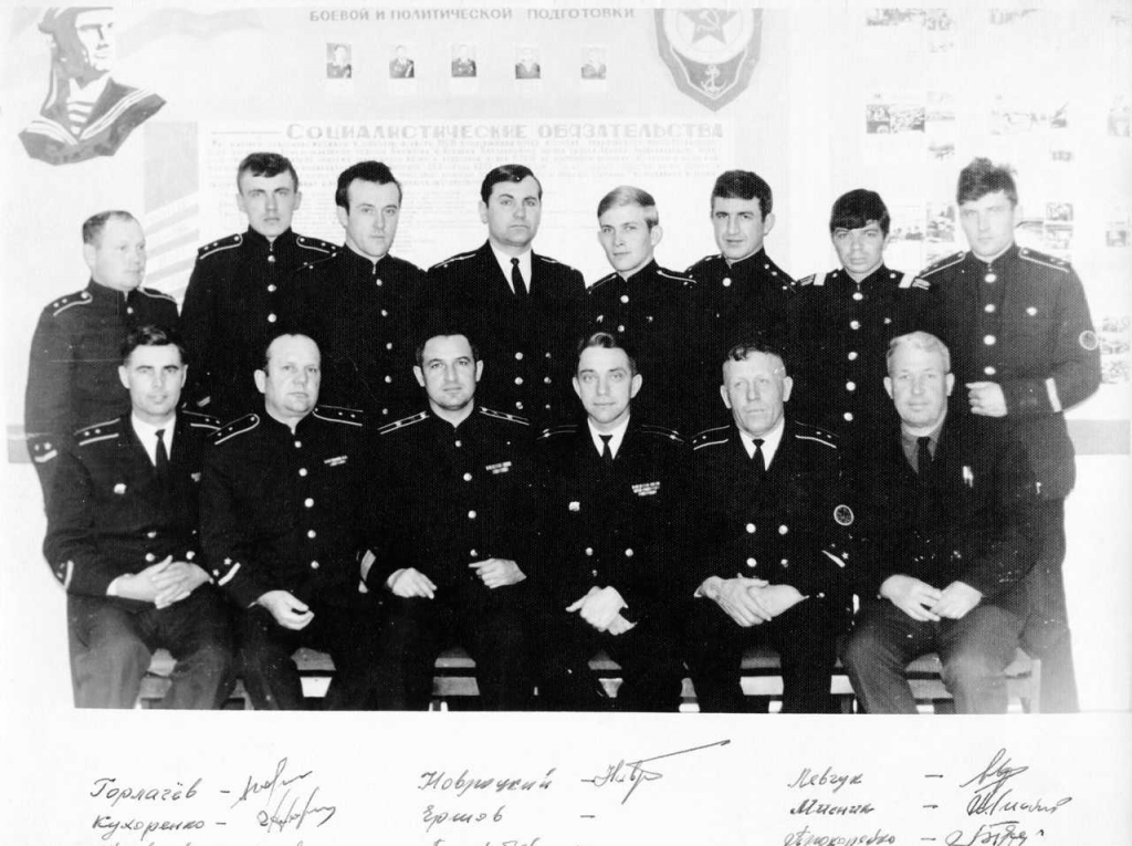 Справа налево стоят (первый ряд) : капитан 3 ранга Суров А.В., капитан 2 ранга Зайцев В.А., майор Волков, капитан 3 ранга Васильев Е.А., капитан 1 ранга Лукаш Д.Т., подполковник Дрейчук Б.Д., капитан 2 ранга Иванников И.И., капитан 3 ранга Кияшко М.М., мичман Худич Н.И. |