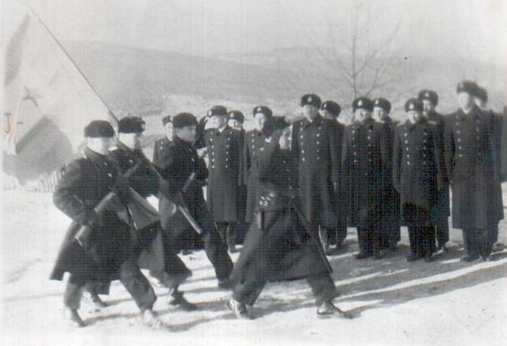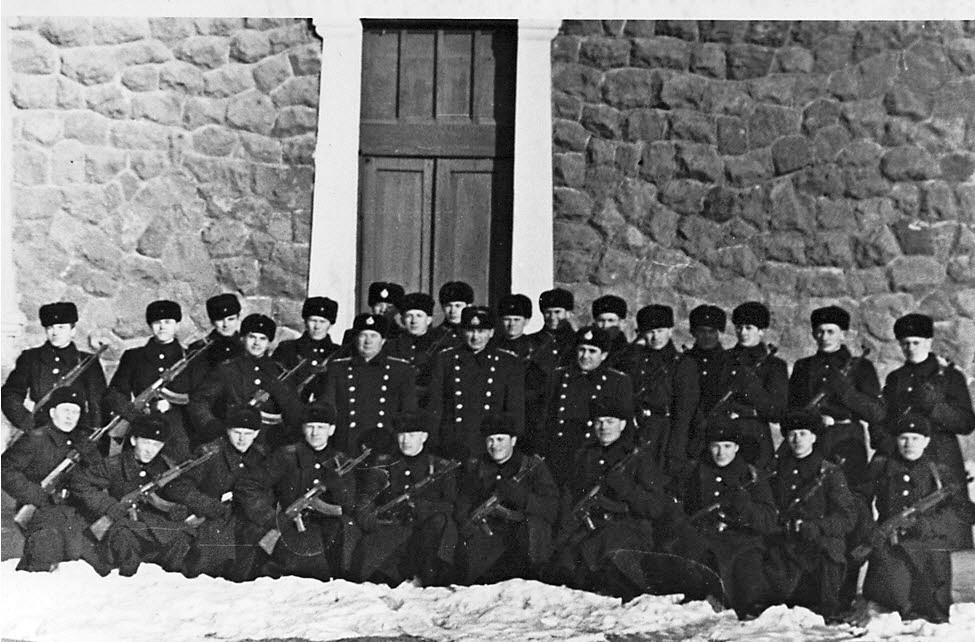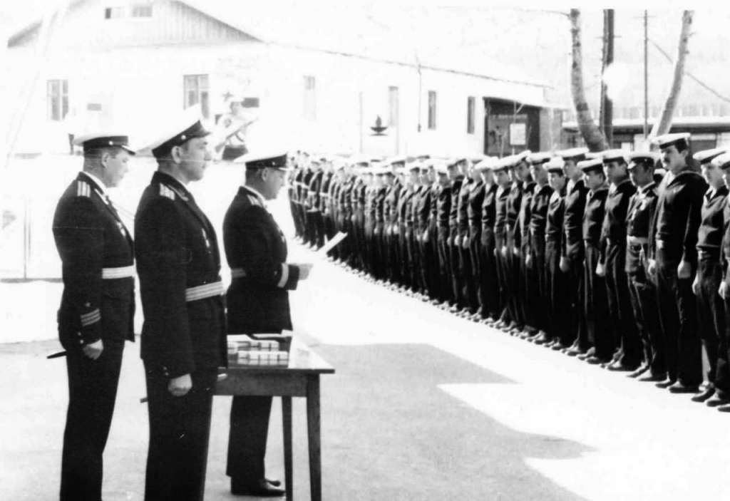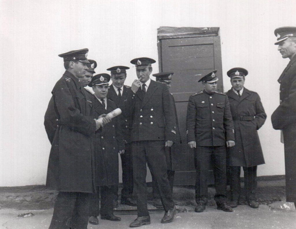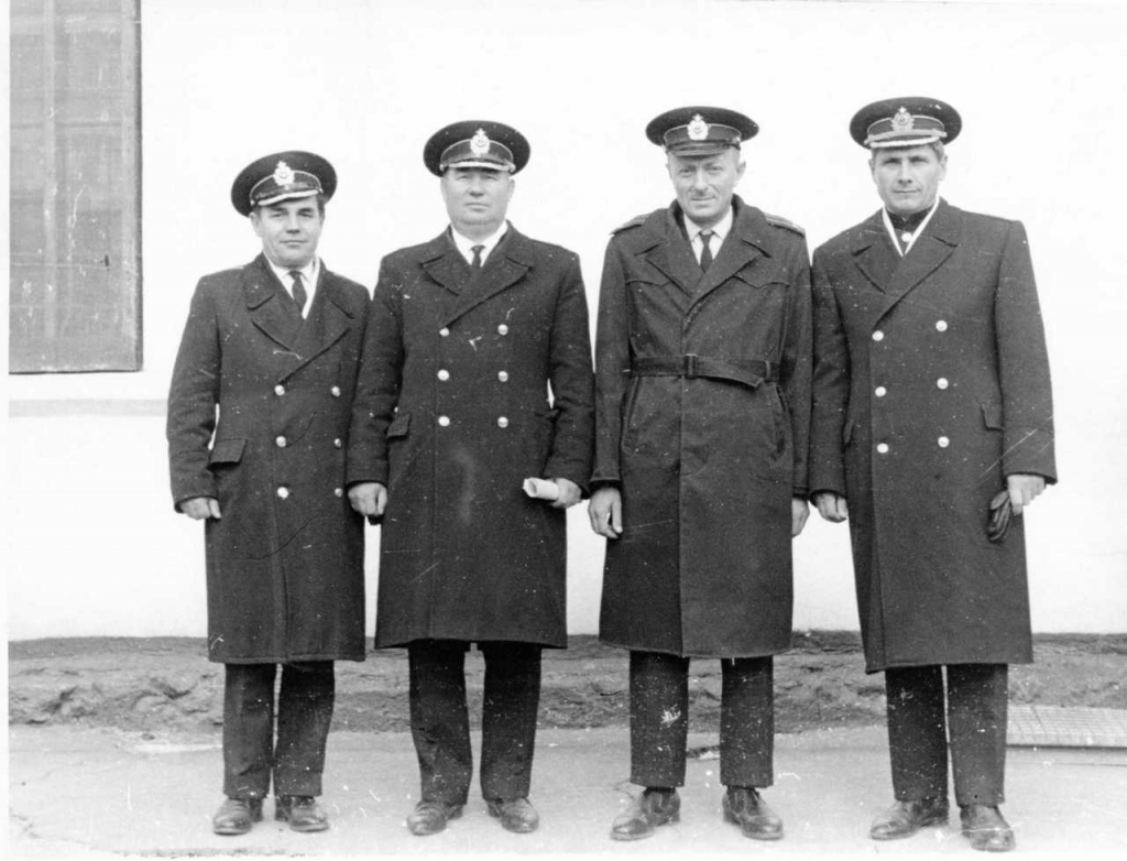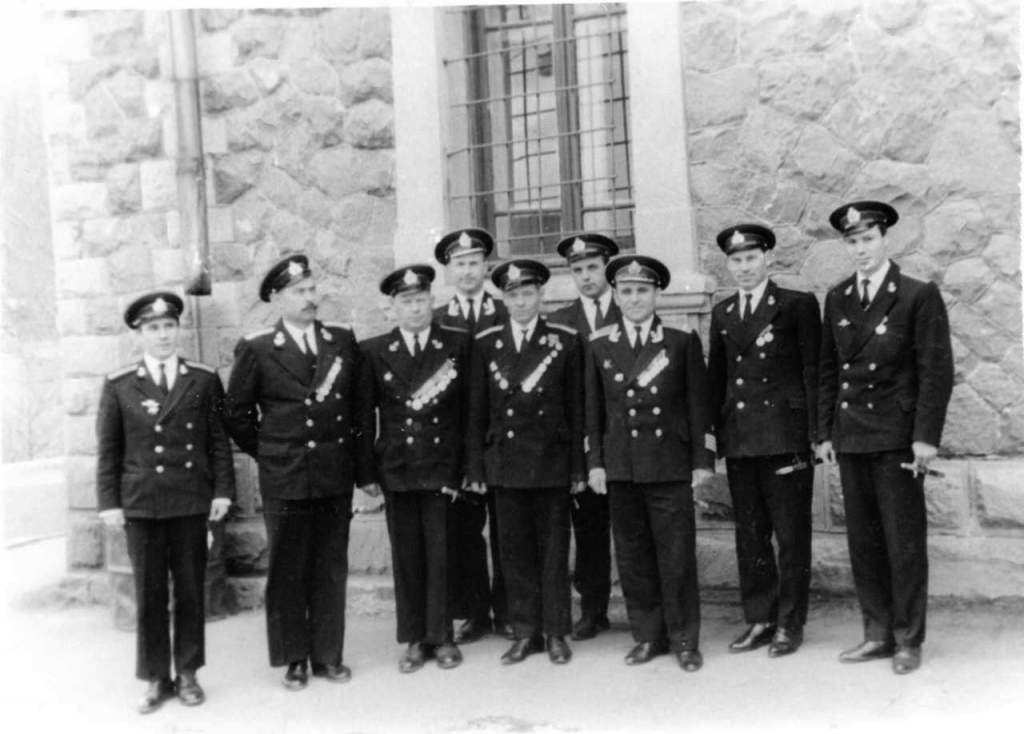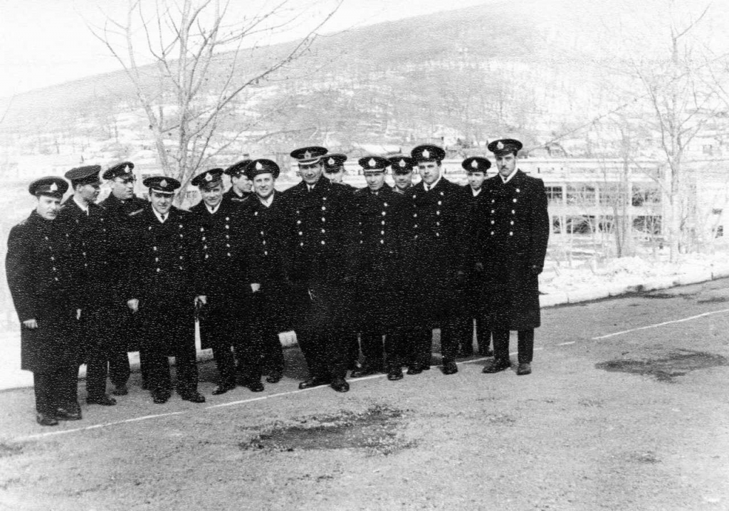 Справа налево стоят (первый ряд) : капитан 3 ранга Суров А.В., капитан 2 ранга Зайцев В.А., майор Волков, капитан 3 ранга Васильев Е.А., капитан 1 ранга Лукаш Д.Т., подполковник Дрейчук Б.Д., капитан 2 ранга Иванников И.И., капитан 3 ранга Кияшко М.М., мичман Худич Н.И. |
