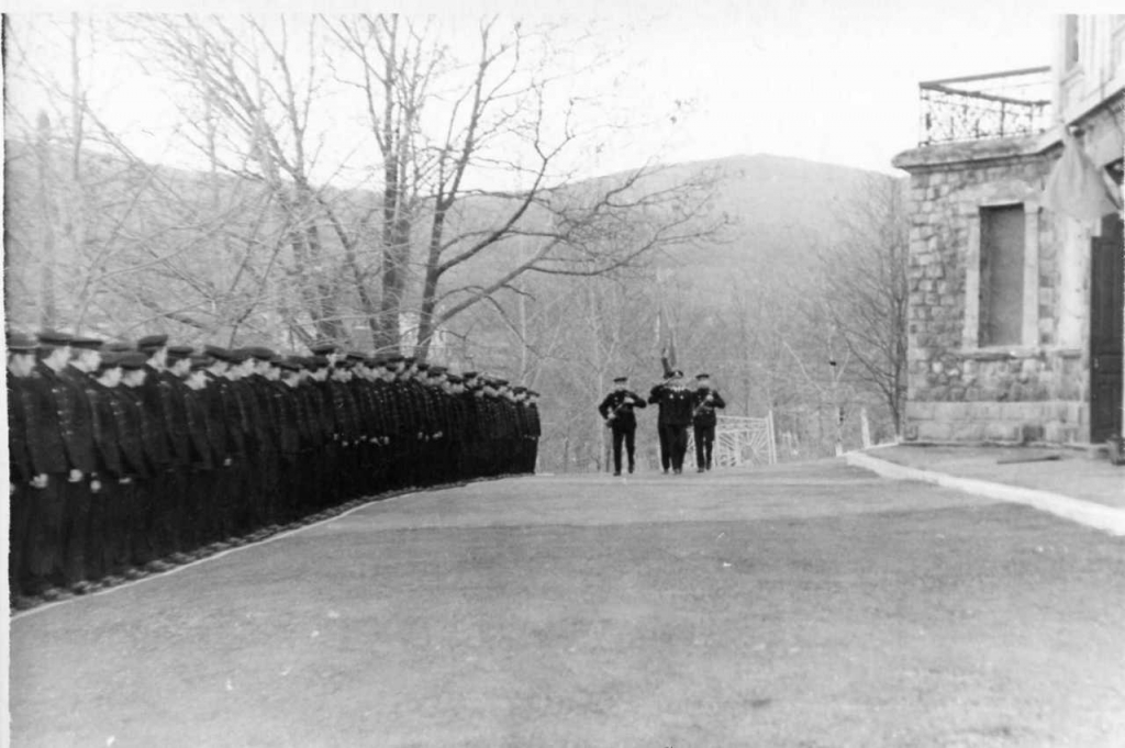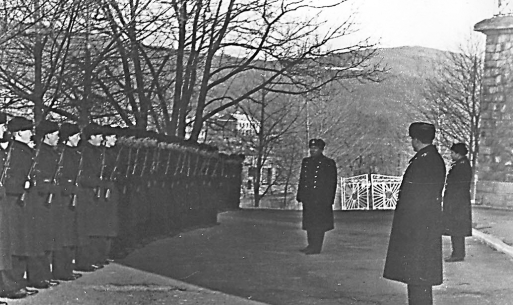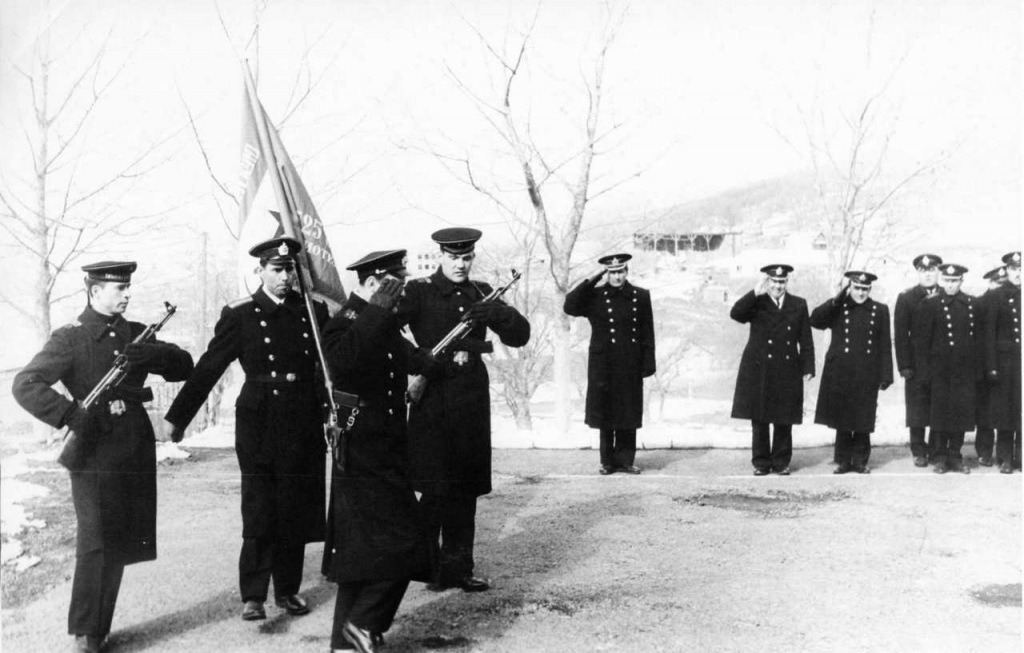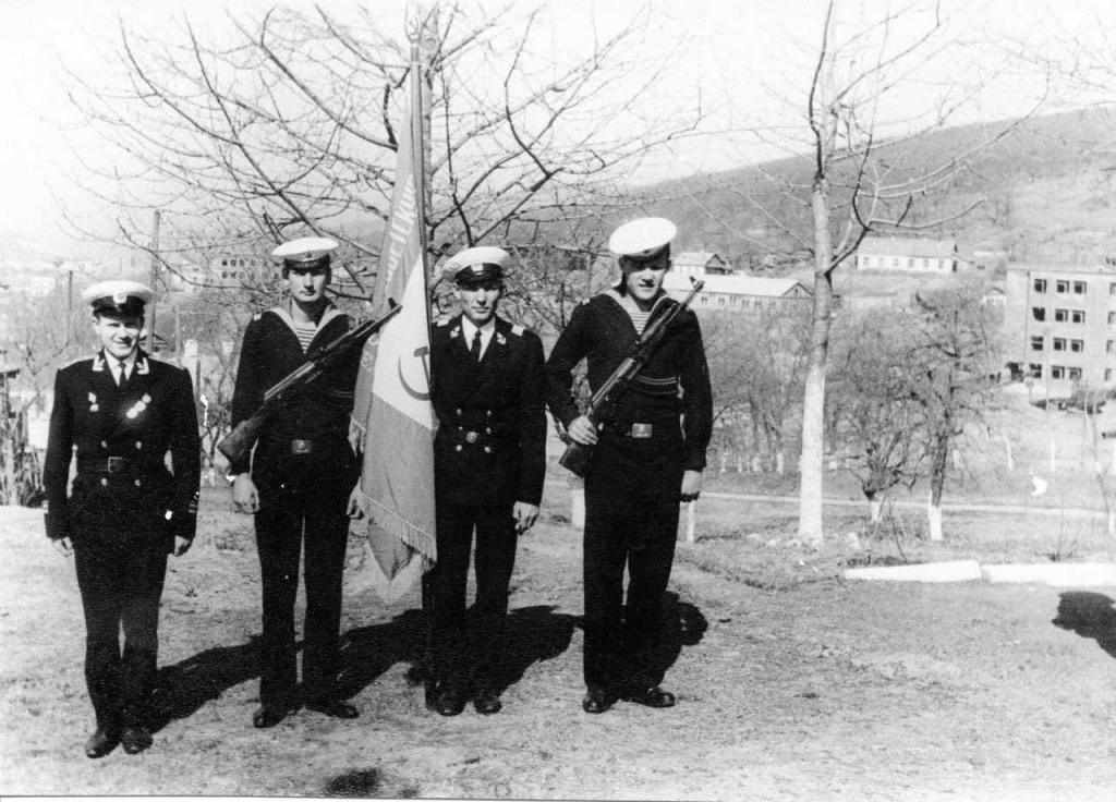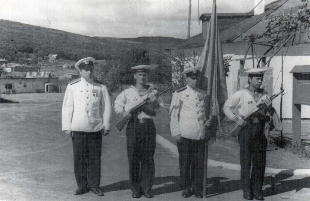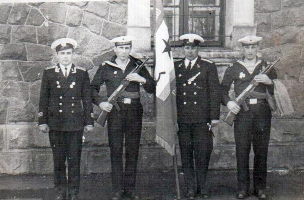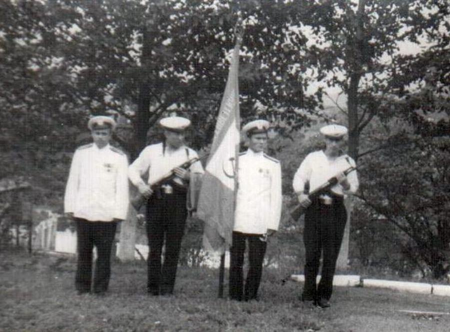 Командир знаменного отделения лейтенант Матвеев Геннадий Андреевич, знаменосец - мичман Худич Николай Иванович, 1967 год. |