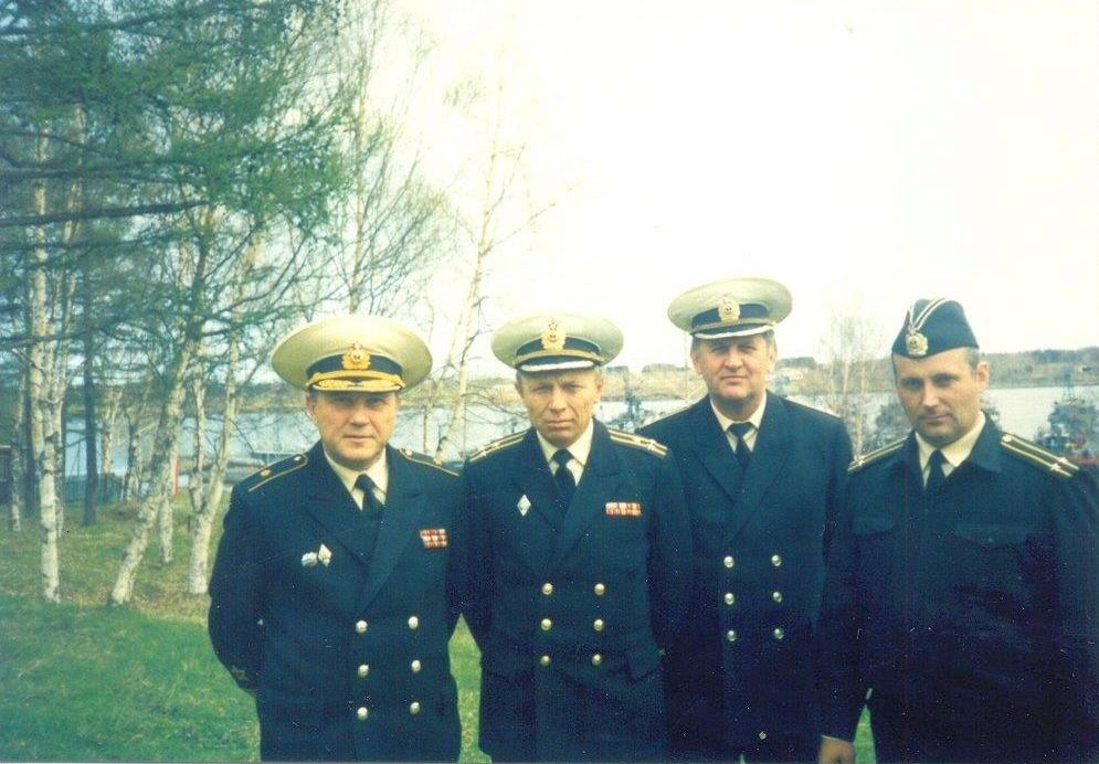 Май 1996 год, слева направо: начальник Разведки ТОФ контр-адмирал Карев В.А., командир МРО-2 (п. Советская гавань) капитан 1 ранга Рогов О.П., начальник отдела РУ ТОФ капитан 2 ранга Смирнов М.Г., начальник штаба МРО-2 Шиш М.П. |