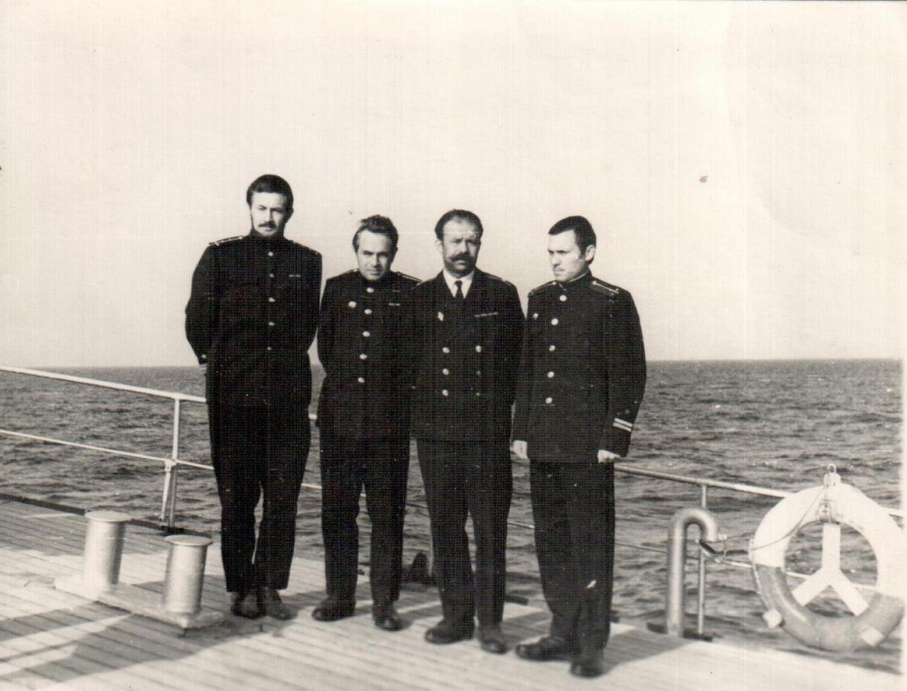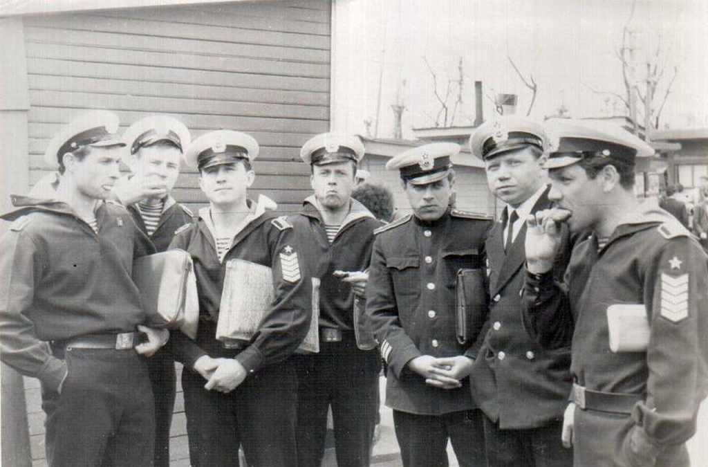 Группа офицеров и мичманов 19 ОМРТО. Слева направо: капитан 3 ранга Клопов С.А., лейтенант Струков В.Я., капитан 3 ранга Курицын Г.И., капитан-лейтенант Лисицын В.И., мичман Шевченко Г.В., мичман Петрашин Ю.С., 1 мая 1968 год. |