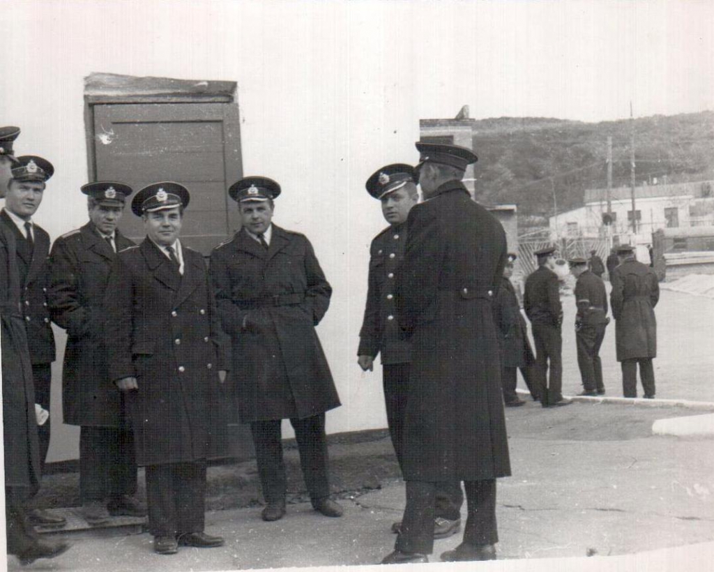 1969год. Слева направо:майор Волков-врач отряда, кап3 Терехов Ю.П.-нач ЦОИ, лей-т Струков-начфин, кап 3 Суров А.В.-ком-р отряда, мичман Щёголев В.А.- нач-к СДП, кап 3Васильев Е.А.-ст.помощник НШ бригады, кап-лей Лисицын В.И.=зам ком.отряда по техчасти, капитан Грищенко Н.М. |
