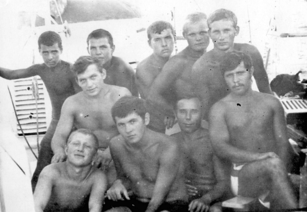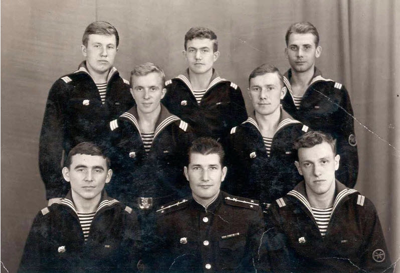 Военморы с МРЗК "АМПЕРМЕТР",1-й ряд: Костя Халин - СПС, Евгений Петрович Чесноков - начальник РТС, Коля Жбанов - боцман,2-й ряд: Володя Захаров - трюмный машинист, Гена Сызганов - акустик, 3-й ряд: Серёга Чулков - радиометрист, Володя Балакин - радиометрист-навигатор, Петя Казаков - радиомастер. Июнь 1968 г. Последний месяц совместной четырёхлетней службы. |