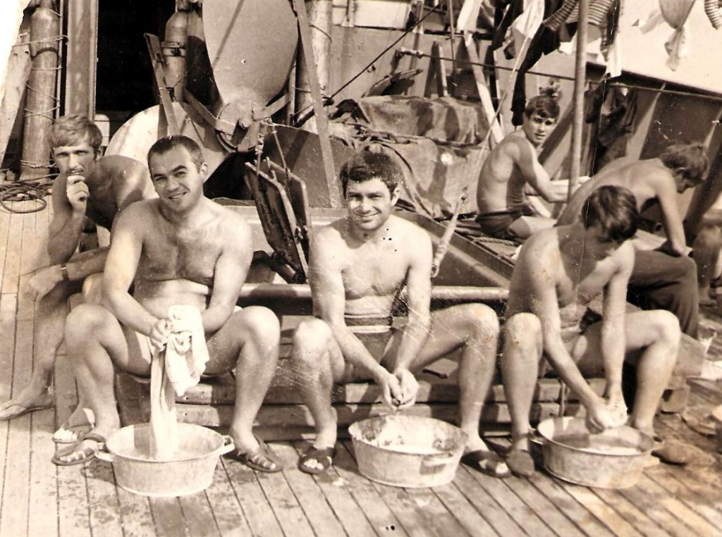 МРЗК "Амперметр" .Банно-прачечный день в дальнем походе. Второй слева помощник командира О. Л. Кучин . |