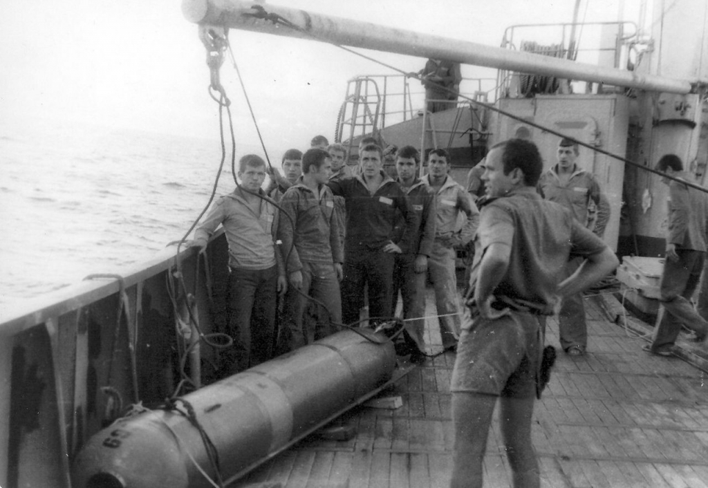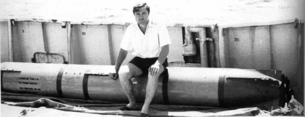 Командир мрзк "Анероид" В.К. Пивоваров сидит на поднятой торпеде МК-37. |