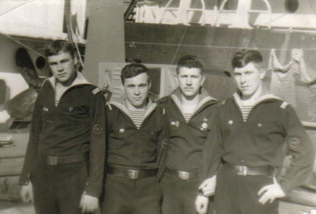 Моряки призыв 1973 года _ Мануилов Владимир, Сусиков Валерий, Иващенко Валерий, Милованов Владимир, во время докования в 178 заводе. |