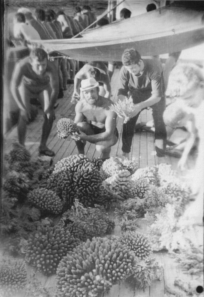 В этот поход на корабль была прикомандирована группа спецназа "холуаевцы" в составе пяти человек. Снаряжение группы разместили в первом трюме, повесили замок, а ключ забрал старший группы. Несением вахты группа была не обременена, посматривали в бинокуляр на побережье и делали зарисовки. Основная задача "холуаевцев" стала ясна позднее, когда мы пришли на банку за кораллами. Из трюма было извлечено водолазное оборудование - дыхательные аппараты, которые не оставляли воздушных пузырьков. Спустили катер за борт, на него погрузились три спецназовца в подводном снаряжении и началась основная работа. Двое погрузились в воду и стали добывать кораллы, а третий их страховал. Небольшая часть добытых кораллов видна на фотографии. Всего было добыто столько кораллов, что они были помещены в пять или шесть больших ящиков. Качество кораллов было отличное, никаких повреждений, которые обычно остаются на кораллах при добыче их традиционным способом - размочаленный швартовый канат с грузом бросается за борт и тянется вдоль борта пока канат не зацепится за кораллы, после этого коралл отрывают от грунта и поднимают на борт.