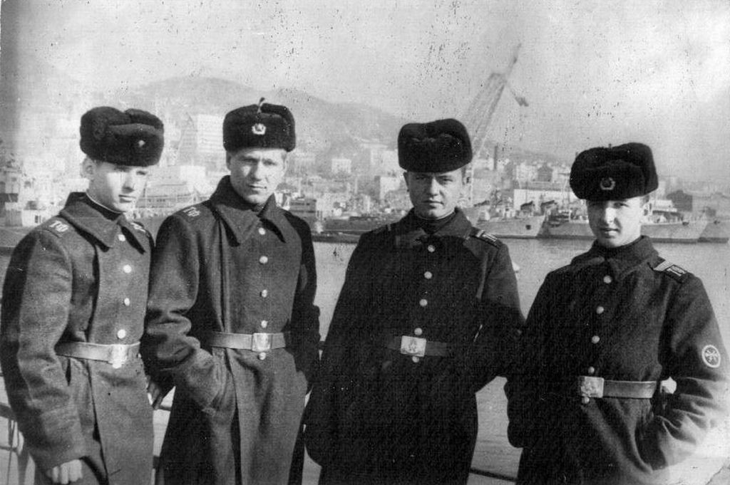 Из архива Кривошеева В.В. МРЗК "Анероид" Кривошеев В., Юра с версты, Пивоваров В., матрос в форме капитана 3 ранга, Кириллин В., Пряслов А. |