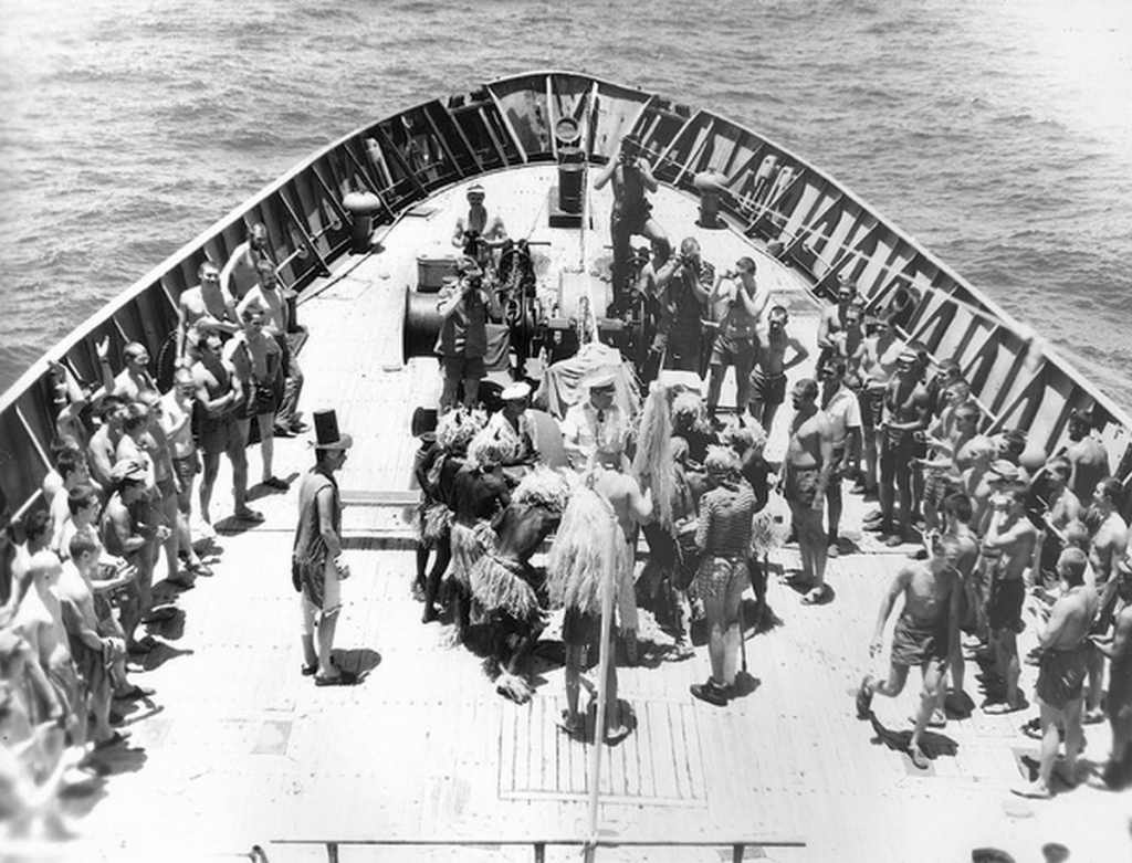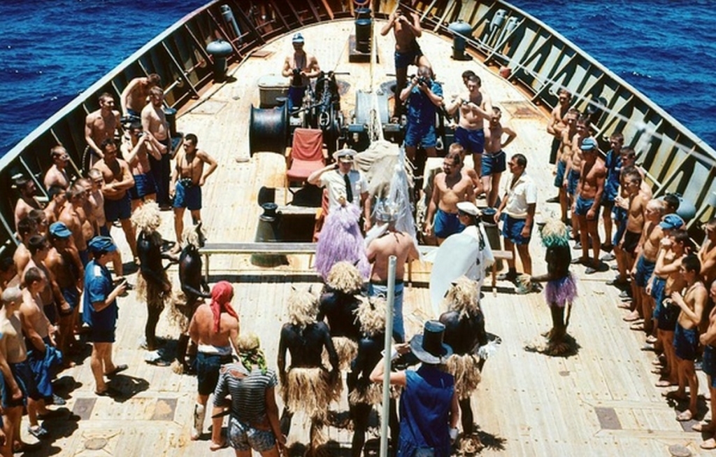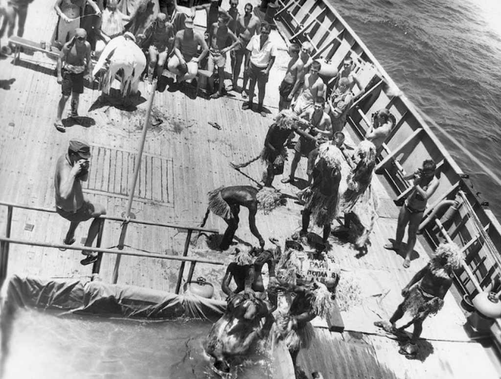 Из архива Волкова А.Е. День ВМФ 1989г. Прием доклада Нептуна командиром корабля. |