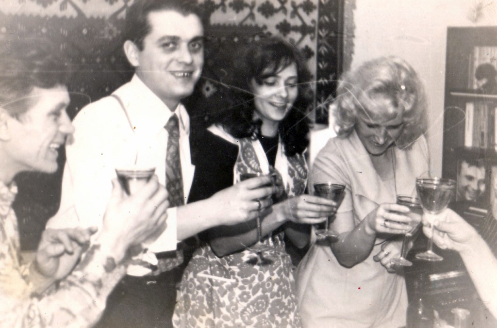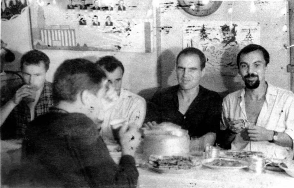 Встреча 1973 года . Слева направо: ст. лейтенант Б. Щадрин, ст. лейтенант А. Дьячек (врач), супруга командира БЧ-5 Ю. Пучкова, супруга А. Дьячека. Все офицеры МРЗК "Дефлектор". |