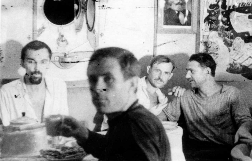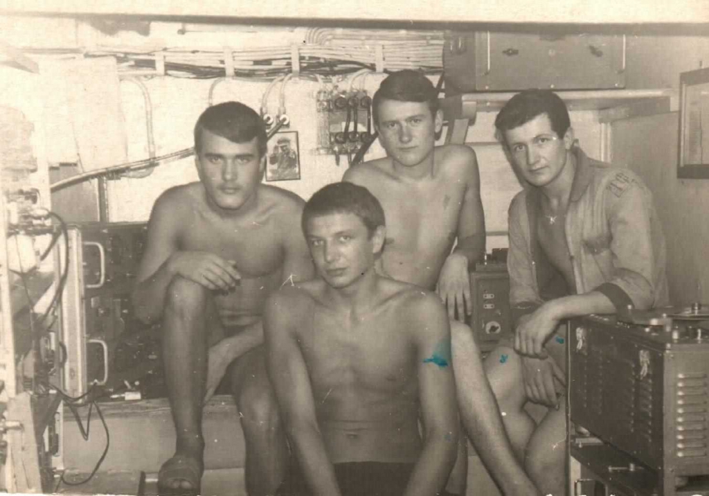 Крайний слева (стоит) командир отделения мотористов главный старшина Виталий Ануфриев, сидит справа к/о электриков старшина 1 статьи Г.Пимонов, стоит второй справа трюмный старший матрос Г.Богданов. |