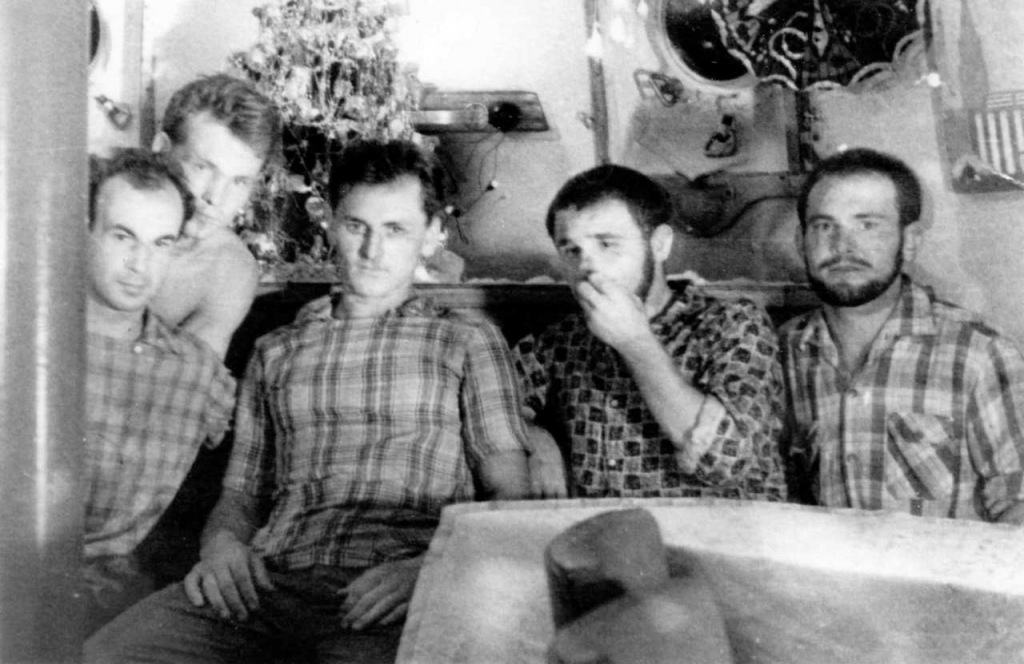 Из архива Максимова Ю.Н. Район острова Гуам, встреча Нового 1965 года. Слева направо: помощник командира корабля Щукин, командир корабля Востриков В.Г., командир БЧ-5 Перов В.М. (стоит), начальник РТС Еремеев Г.Н. (лицо закрыто рукой), на первом плане командир РР с "шестой версты". |