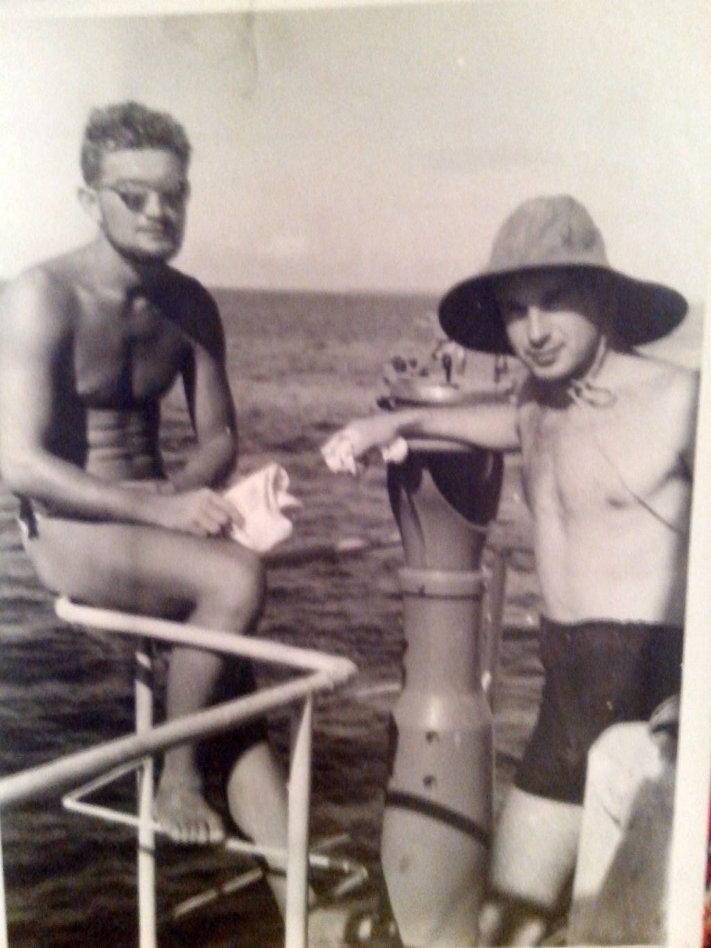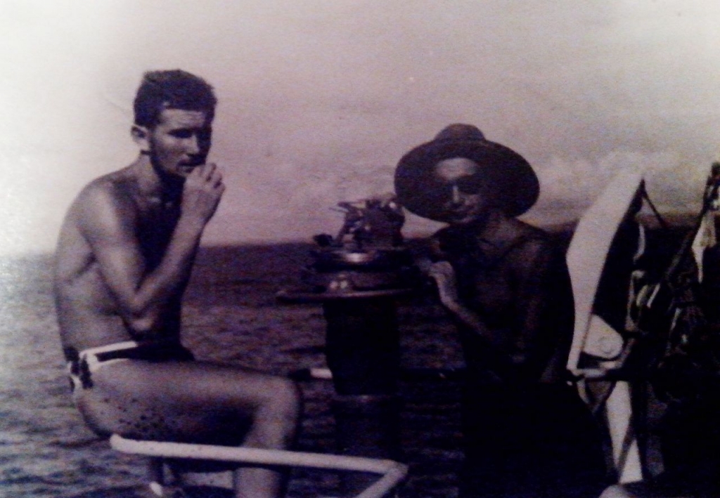 Из архива Максимова Ю.Н. Район острова Гуам, встреча Нового 1965 года. Слева направо: врач Грановский Л.И., боцман, интендант, на первом плане офицер с "шестой версты". |