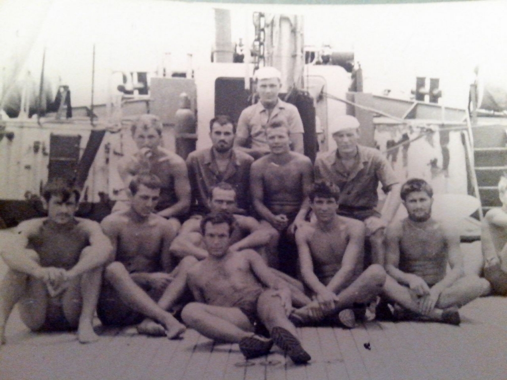 "Южно-Китайское море 7 ноября 1971г. Слева направо 1-ый ряд: -Лебедь В. ,- 2-го не помню,- Антоненко В.М., Гимодеев Ф.Н., Дутов И.Н. , Жуков В., Козлов В.И.,Донцов В., Куликов В.В