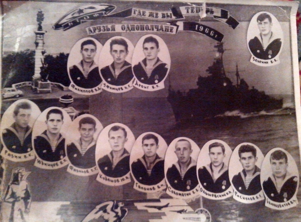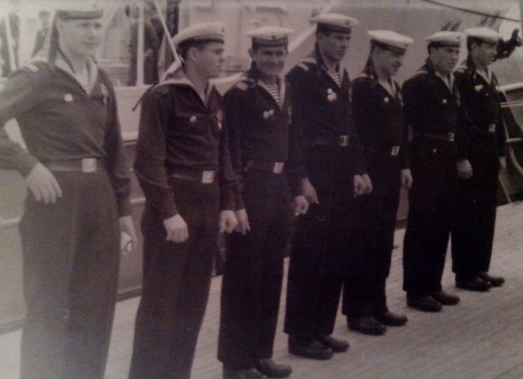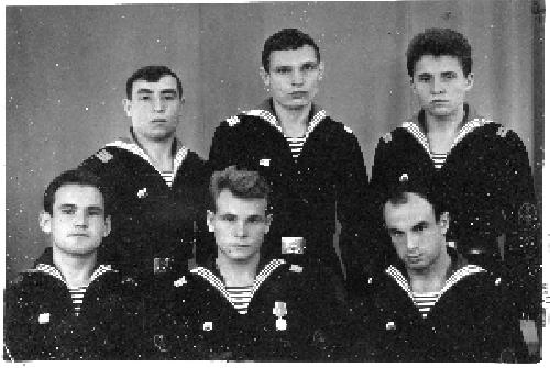 2-ый ряд: моряк из БЧ 5, 3-й Зотов, 4-тый Тарасов О., Барахоев А., Кок, Шаров А., радист." Антоненко В.М.