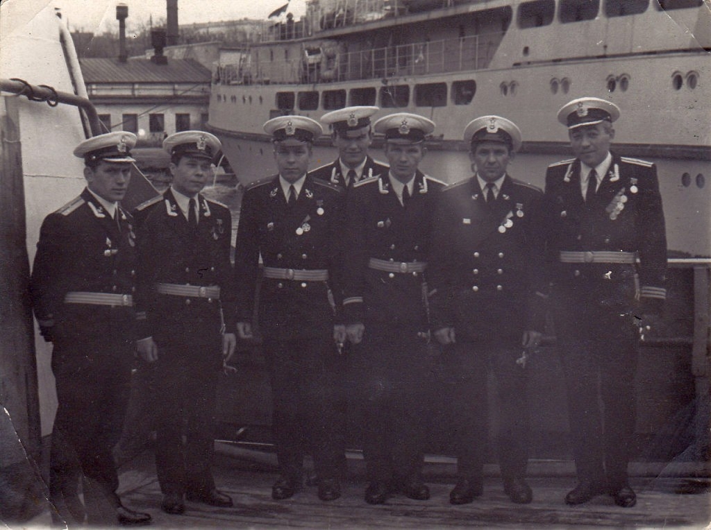 МРЗК "Дефлектор" 1972 г. Командный состав корабля: слева Кучин О.Л. Яворчук П.П. Дьячек..., Заколюкин Г.Е.Архипов .., Воробьев А.В., Майтаков Г.Г.