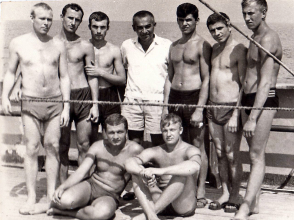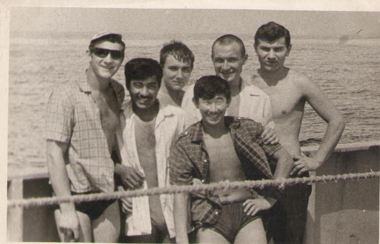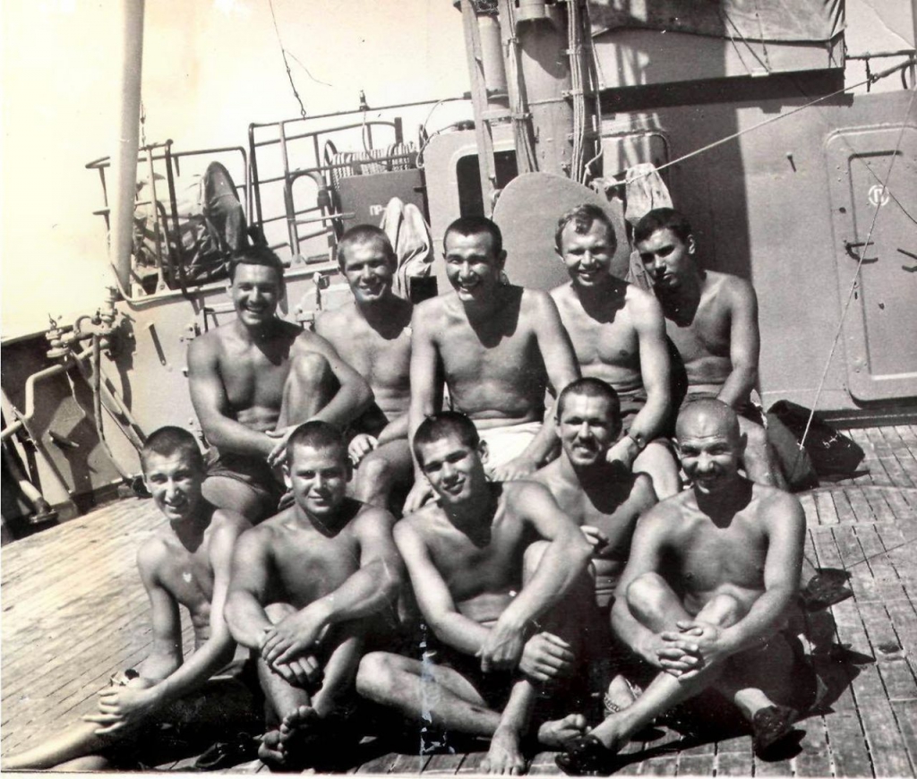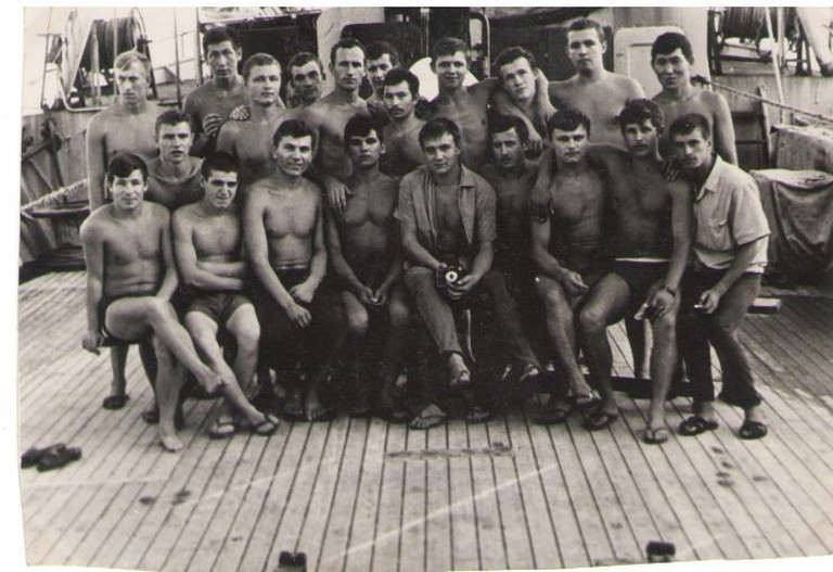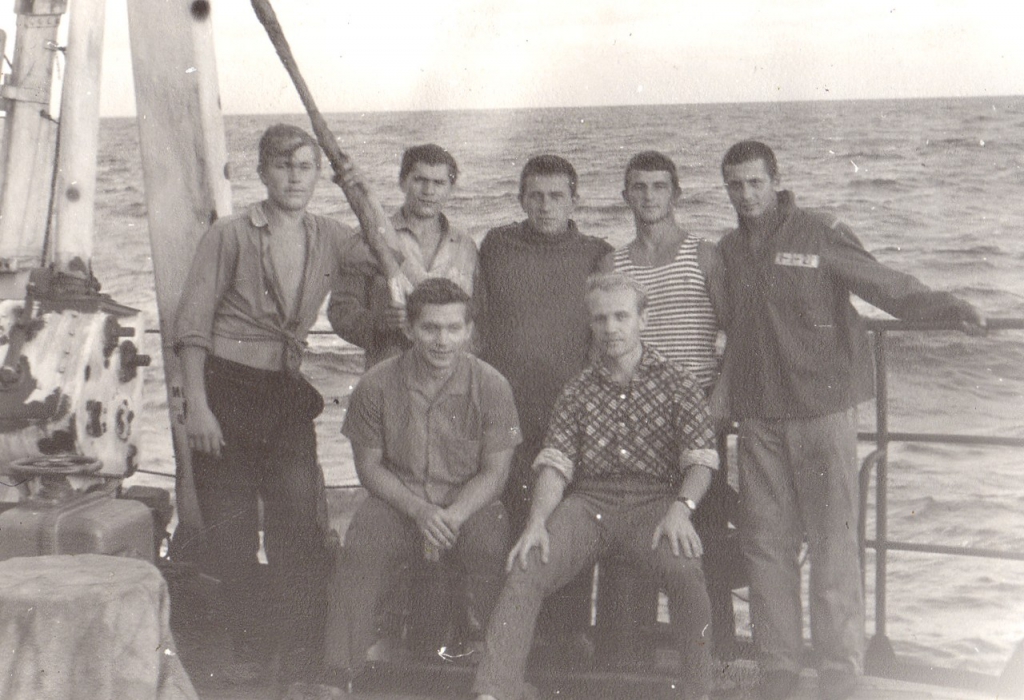 "Первый поход в Южно-Китайское море, октябрь 1970 год. Первый ряд: Козлов В.И., Дутов И.Н., Комаров В.А., Долгих В., Каменев А., 2-й ряд: Я, Павлов А., Шадрин В.А, в БП-3."