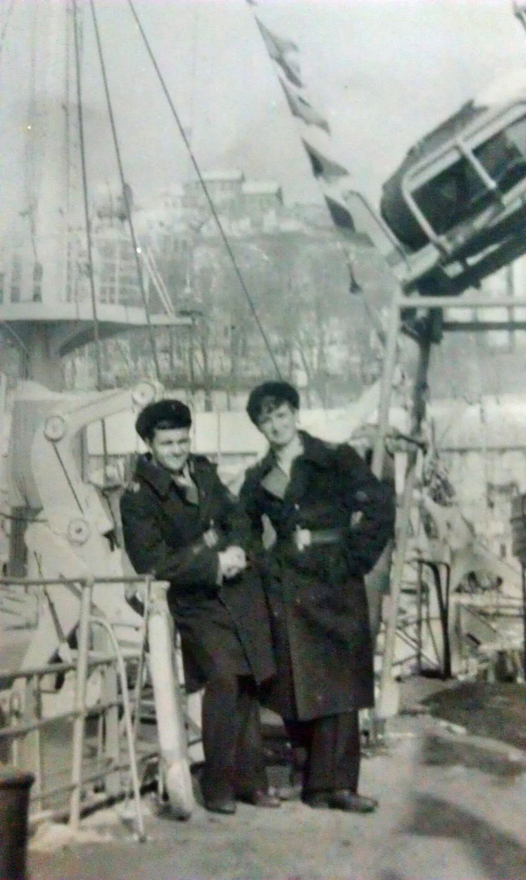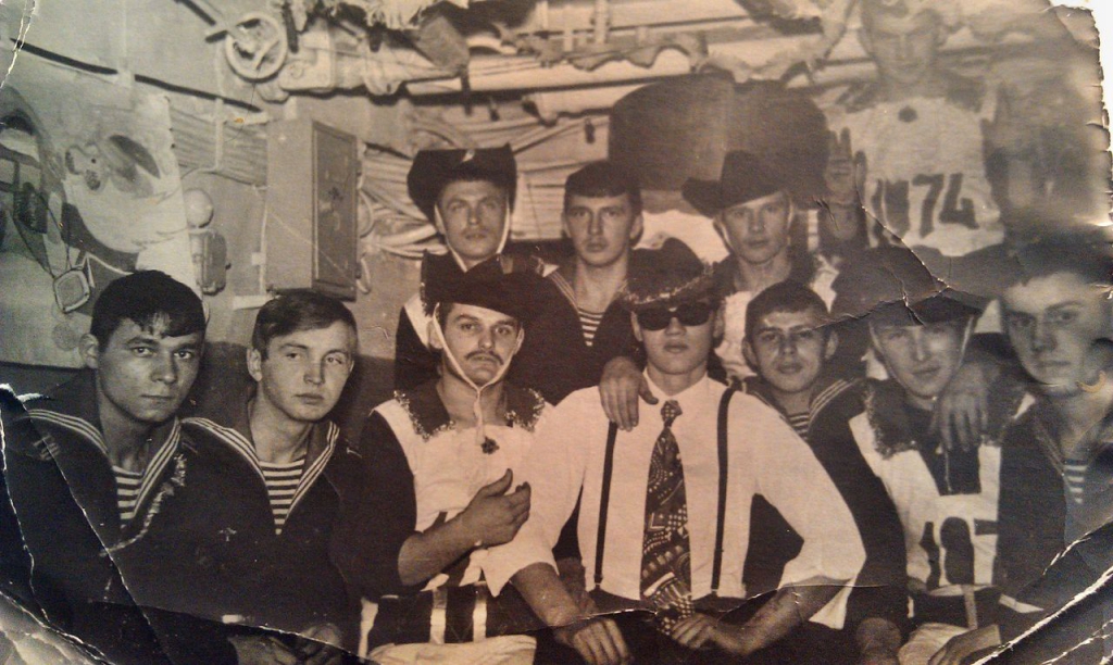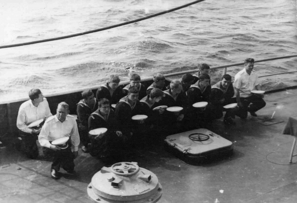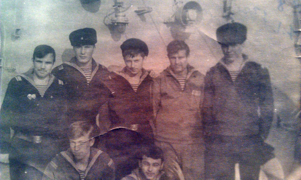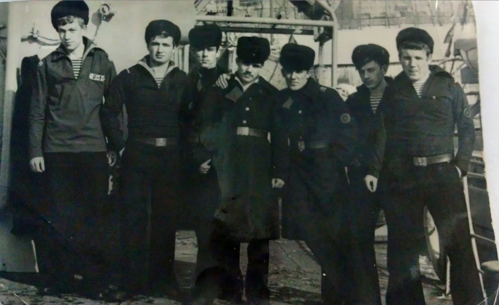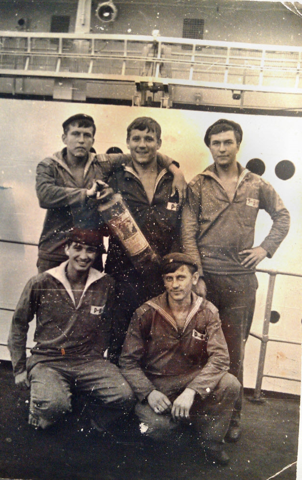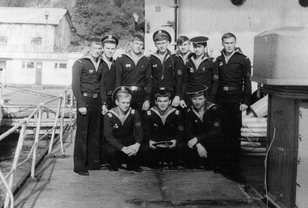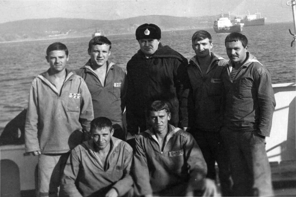 "Сентябрь 1973-го. ЭОС"Забайкалье"на выходе из бухты Золотой Рог. Курс в район несения боевой службы - американский ракетный полигон атолл Кваджелейн, длительность плавания - 120 суток. На юте прикомандированная группа радиоразведки.Слева направо верхний ряд- Вася Довганюк,Валера Масюков,Начальник разведгруппы кап.2 (фамилию не помню),Володя Гаврилов,Юра Хмелев. Нижний ряд слева направо Витя Калинин, ну и я. Не удержусь и расскажу еще одну историю. Володька Гаврилов(звали мы его между собой Гаврюшей) на втором году службы попал в вестовые(по нашему гарсунщик),а командиром тогда на "Гидрологе"бал кап.3 Хороших настоящий морской волк,но водочка его сгубила любил это дело и при каждом выходе в море забирал к себе в каюту канистру со спиртом и надирался конкретно,а надравшись приходил к нам в пост и просил -"сынок поставь Высоцкого".Сам садился , слушал и даже мог иногда всплакнуть под песню -"чуть помедленнее кони".Замполит наш его постоянно закладывал в бригаде за эти дела и кэп его за это люто ненавидел.Короче однажды при выходе на СБР, кэп круто залил и с криками застрелю сволочь стал гоняться за замполитом. Его конечно утихомирили,но по приходу в базу через два месяца,перед очередным выходом в море (за 15 минут до выхода),в бригаду приехал Проценко вместе с нач ПО, вызвали на берег нашего командира и вместо него к нам на борт поднялся новый командир кап.лей.Карачевцев.Жалко было нашего,когда корабль отходил от стенки наш кэп еще долго стоял и по его щеке катилась слеза.А как он круто швартовал корабль!,давал полный ход назад и перед самой стенкой врубал ВРШ и полный вперед ,корабль подбрасывало вверх и корма застывала в полуметре от стенки.Моряки которые принимали бросательные концы на берегу с пересеру разбегались в разные стороны,да кзп был спец высокого класса. Но я не об этом,так вот обязанностью вестового было подавать в кают компонию офицерам харчи,а кэп сильно любил чтобы в борще обязательно был мосел.он его обгладывал высасывал ну вобщем балдел от этого.Первое время Вовик выискивал на камбузе каждый раз новые мослы для кэпа, а потом потихонечку обнаглел и стал один и тот же мосел после еды мыть и на следующий раз опять подсовывать его в борщ кэпу.Но тот быстро это узрел и однажды из кают компании раздался возмущенный вопль командира - "...где этот сукин сын гарсунщик!доставить его сюда немедленно!,я этот е.....й мосел по моему вижу уже в пятый раз!!! Ну и короче Вовик с теплого хлебного места попал на пять нарядов в посудомойку , вот такая была ботва." |