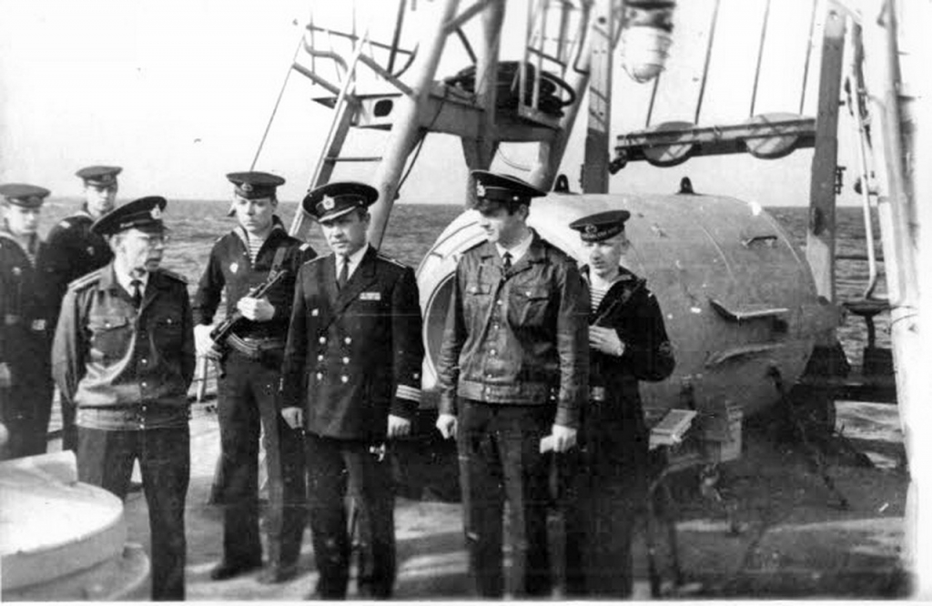 "Проходим Цусимский пролив. Отдание воинских почестей погибшим Русским морякам. На фото первый слева подполковник Кириллов( из центра РЭР), в центре командир ГИСУ"Гидролог"(с 72-го по 73-й год), капитан 3-го ранга Хороших", замполит лейтенант Крыгин. |