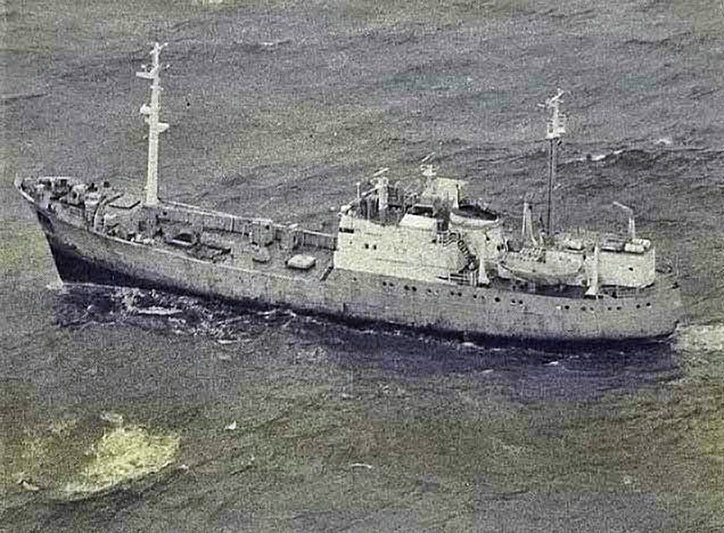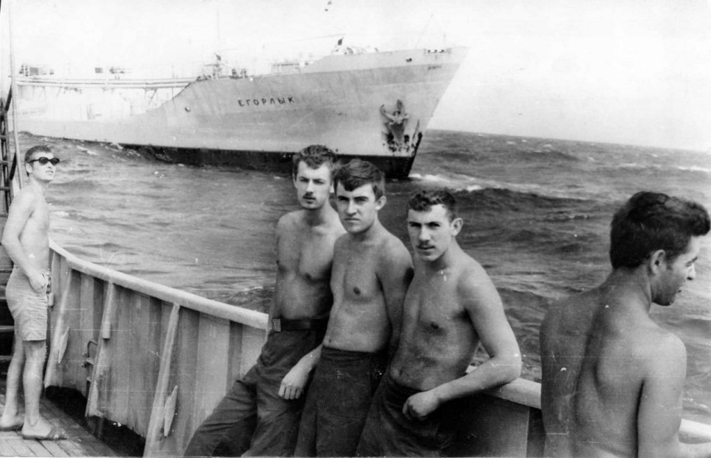 МРЗК "Курсограф" ЮКМ БС 14.12.1972 - 18.03.1973 г. На фоне танкера "Егорлык ". В очках старшина радиометристов мичман Гусак В.Ф. |