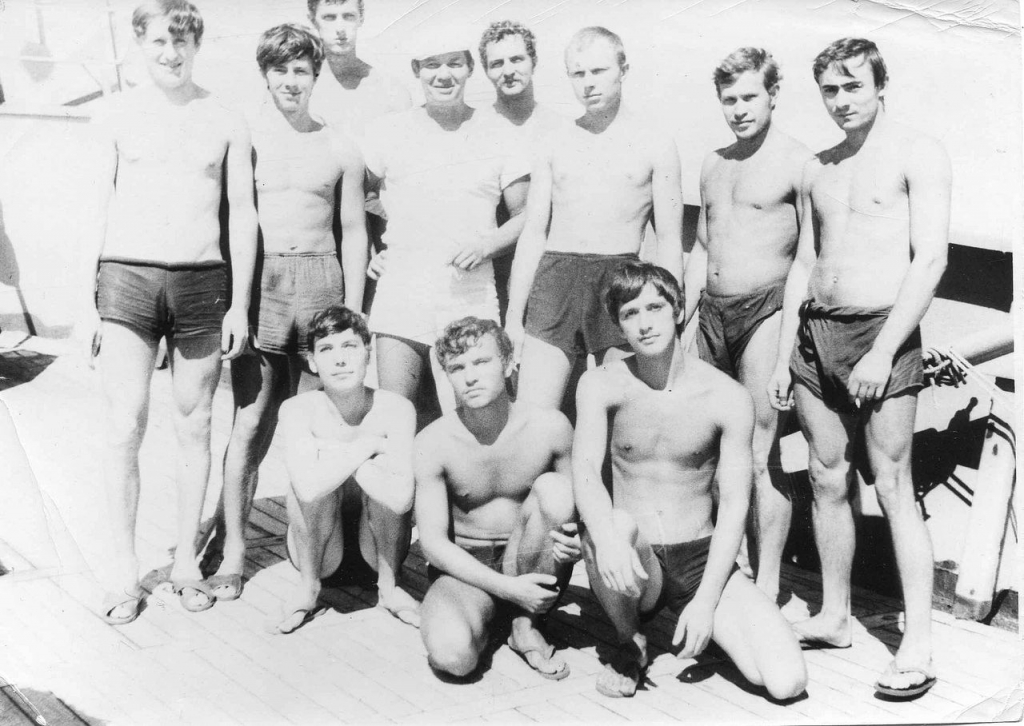 Командир группы капитан-лейтенант Королёв В.В (в центре в белом кепи)., стажеры - лейтенант Рогов О.П. (справа от Королёва), лейтенант Кравцов А.(слева от Королёва). |