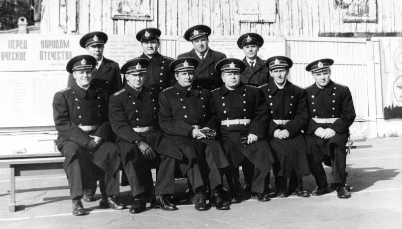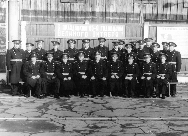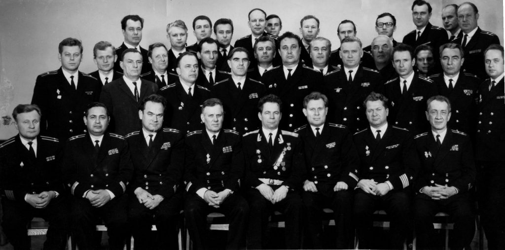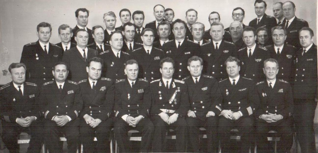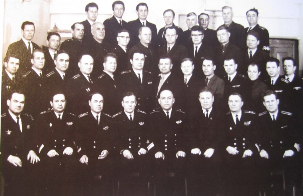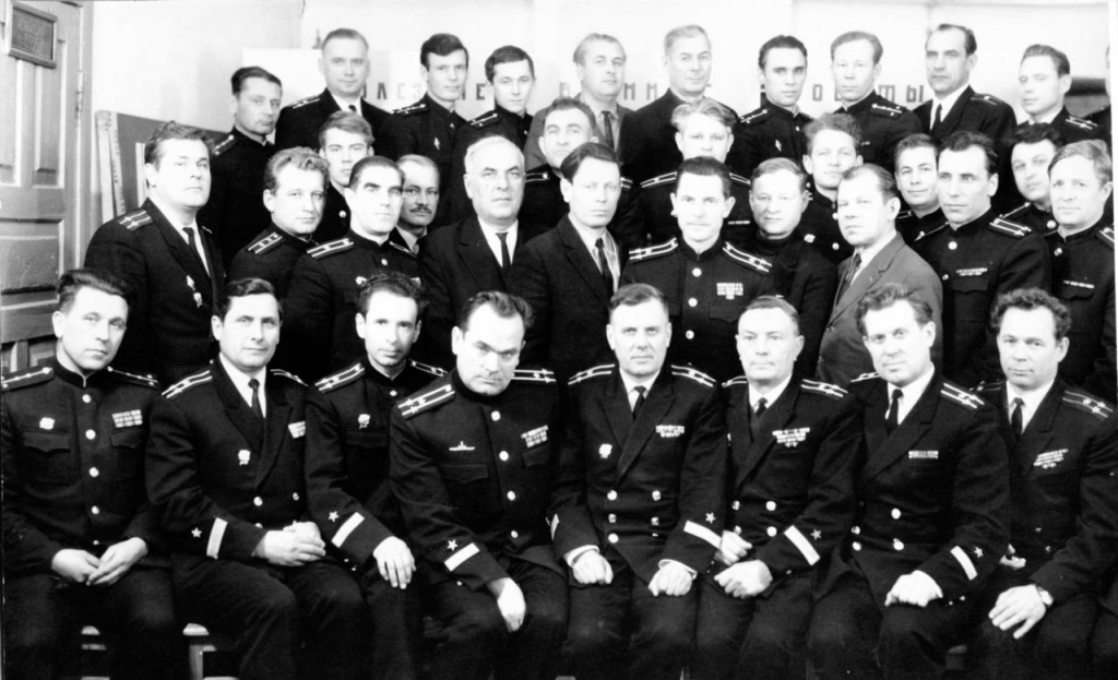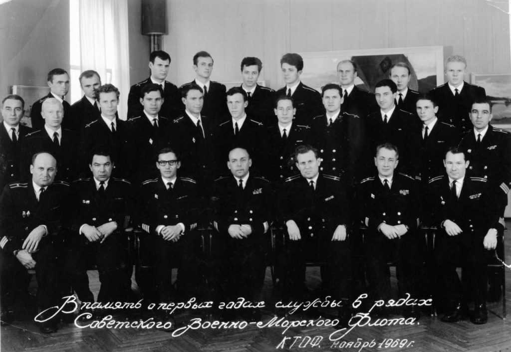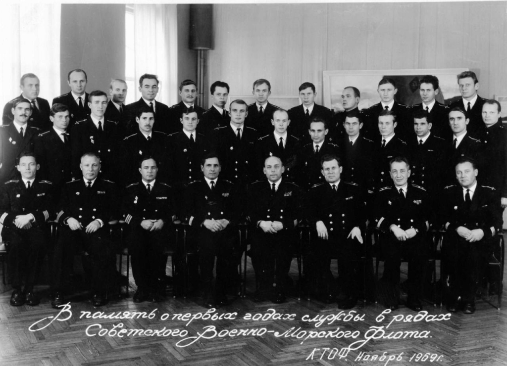 Владивосток, ноябрь 1969 год. Слева направо, первый ряд: кап.3 ранга М.И. Печенкин, кап.3 ранга Милосердов Н.Г., кап.3 ранга Онищенко Н.Е., кап.1 ранга Лукаш Д.Т., контр-адмирал Сотников Н.П., кап.2 ранга Сурженко П.А., кап.1 ранга Никитин М.Г., кап.л-нт Святецкий О.П.; ... |
