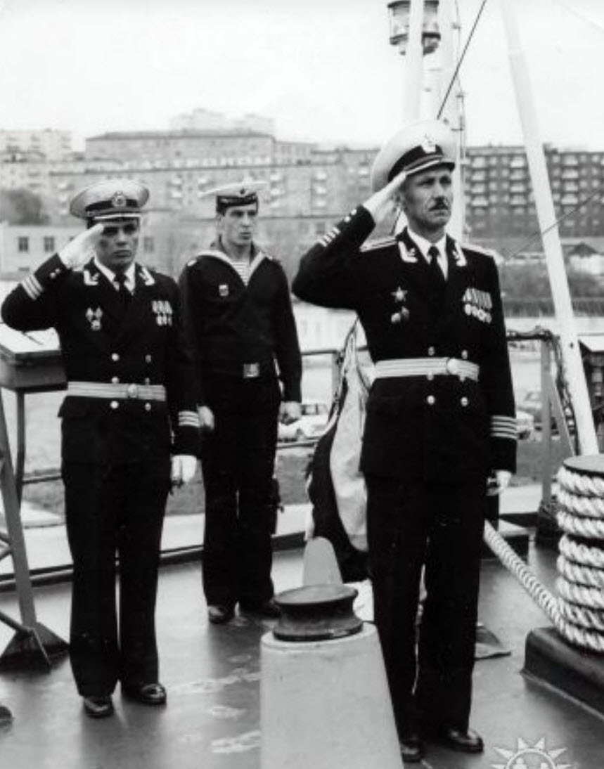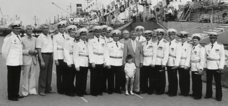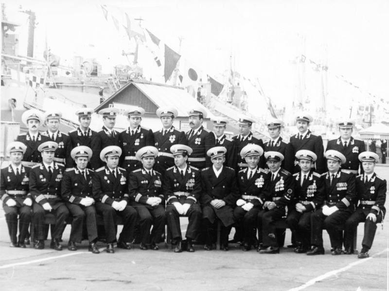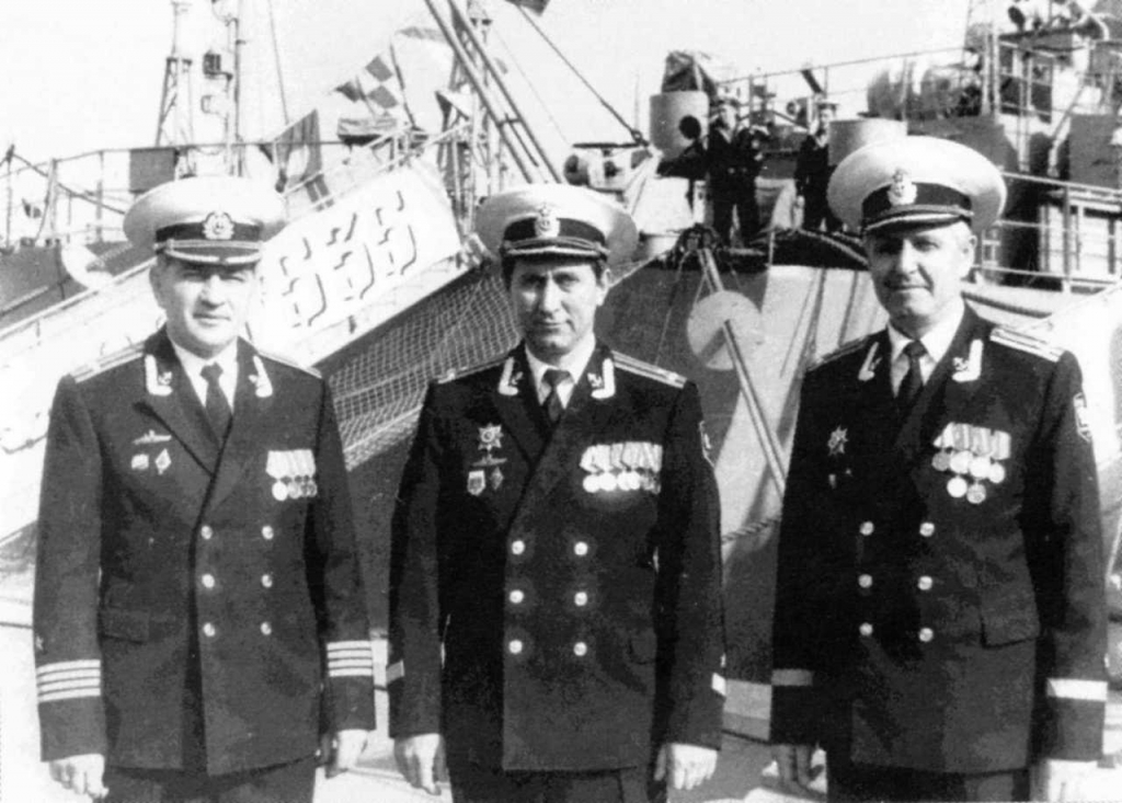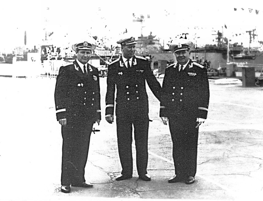 7 ноября 1982 год. Заместитель начальника разведки ТОФ капитан 1 ранга Злобин Г. Д.,комбриг капитан 1 ранга Васильев С.С., командир брзк "Забайкалье" капитан 1ранга Кучин О.Л. с группой командиров кораблей и политработников. |