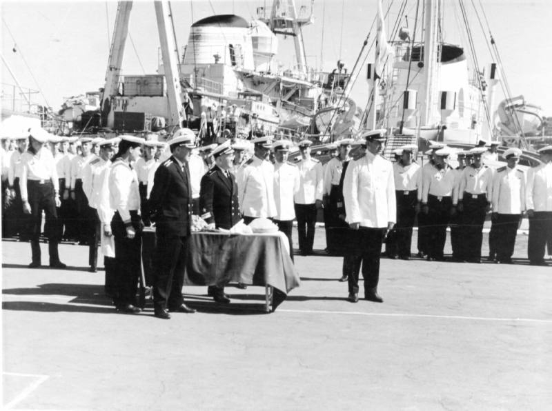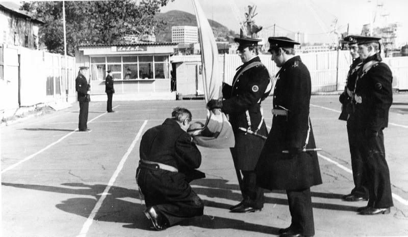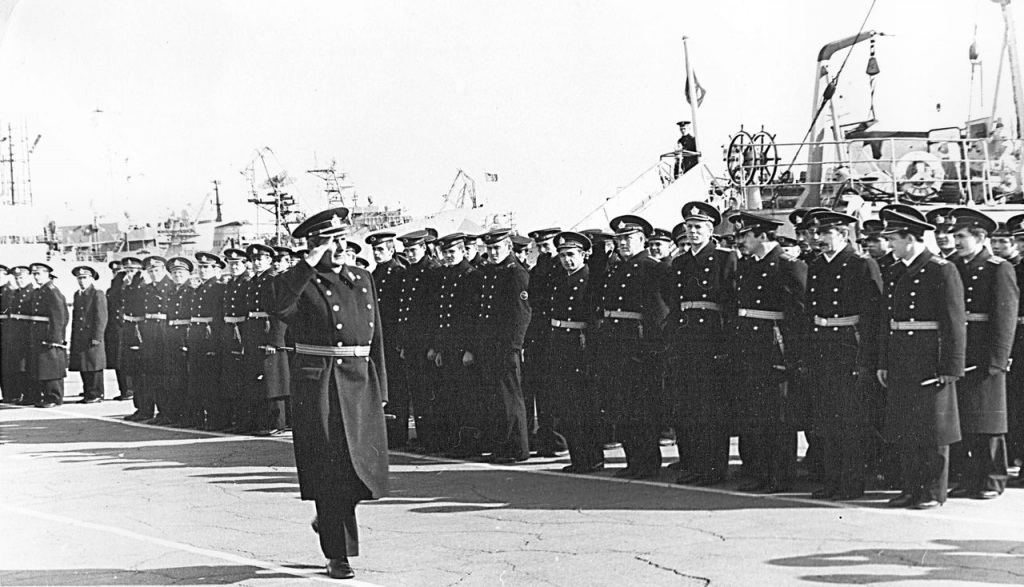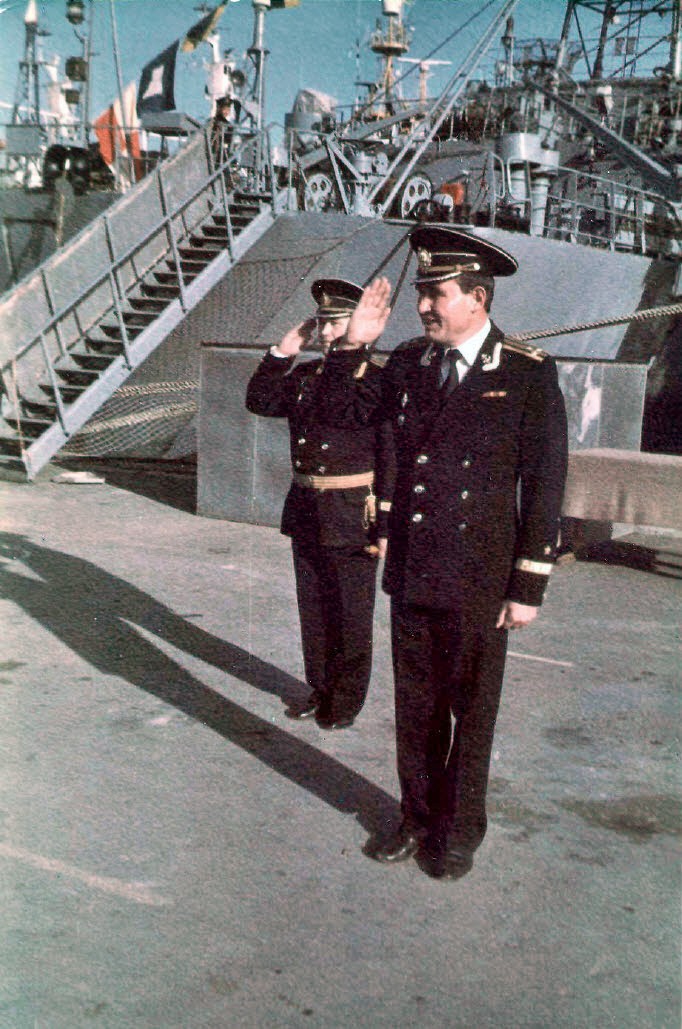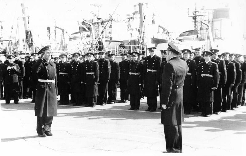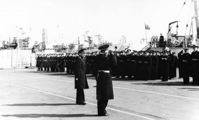 20.10.1978 год. Вновь назначенный комбриг капитан 1 ранга Васильев С.С. докладывает начальнику разведки ТОФ капитану 1 ранга Леонову Г.Ф. о построении личного состава кораблей соединения |