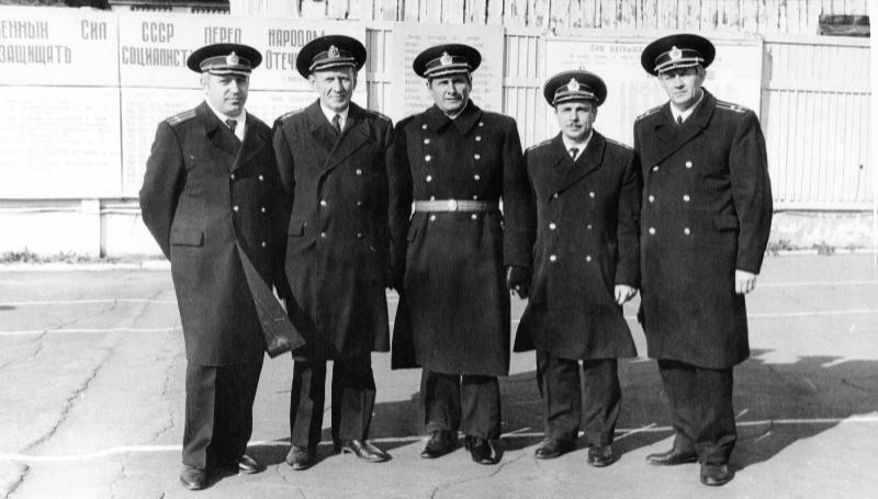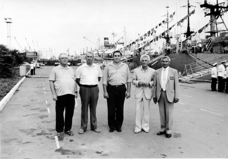 Ветераны бригады на 44 причале порта Владивосток. Справа налево: капитан 1 ранга Лукаш Д.Т., капитан 1 ранга Васильев С.С., капитан 2 ранга Дмитриев Д.И., капитан 1 ранга Лопатин Э.П., подполковник Масленников Ф.Н. 90-е годы. |