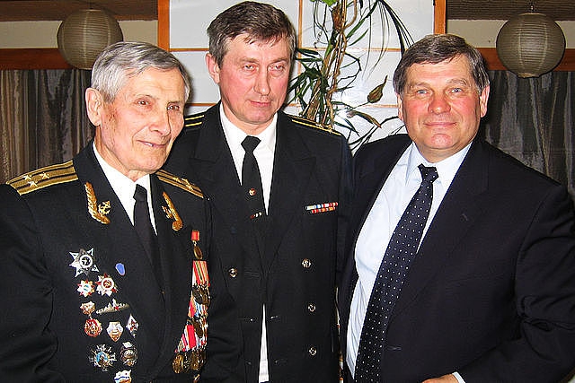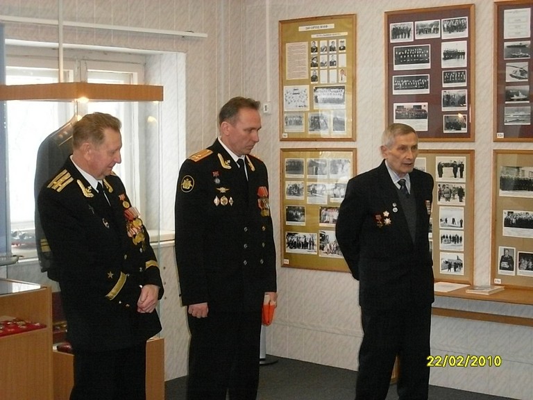Слева направо: капитан 1 ранга Лукаш Дмитрий Тимофеевич (первый командир бригады), капитан 1 ранга Маркин Александр Аркадьевич (последний командир бригады), вице-адмирал Фёдоров Владимир Михайлович (бывший начальник Разведки ВМФ). |