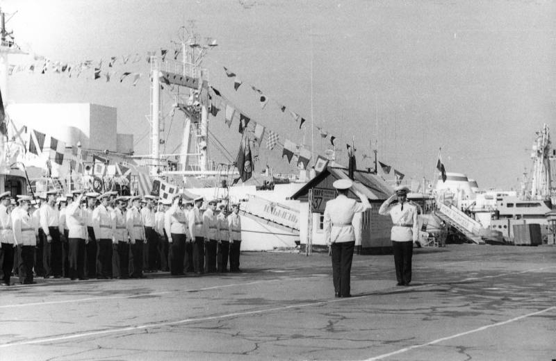 День ВМФ 1978 год. Начальник штаба бригады капитан 1 ранга Максименко Ю.С. докладывает комбригу капитану 1 ранга Лукаш Д.Т. |