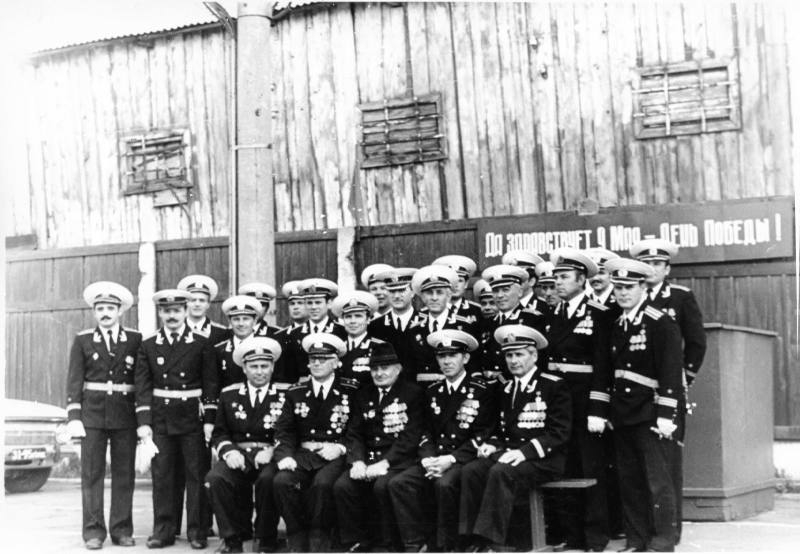 9.05.1982 г. Ветераны бригады. Первый ряд справа налево: капитан 1 ранга запаса Лукаш Д.Т., мичман запаса Григорьев Н.М., мичман в отставке Колбецкий А.Н., (в разведке с 1936 г, старшина катера "Пчела"), мичман запаса Пугач, начальник центра РЭР капитан 1 ранга Шиш П.И. |
