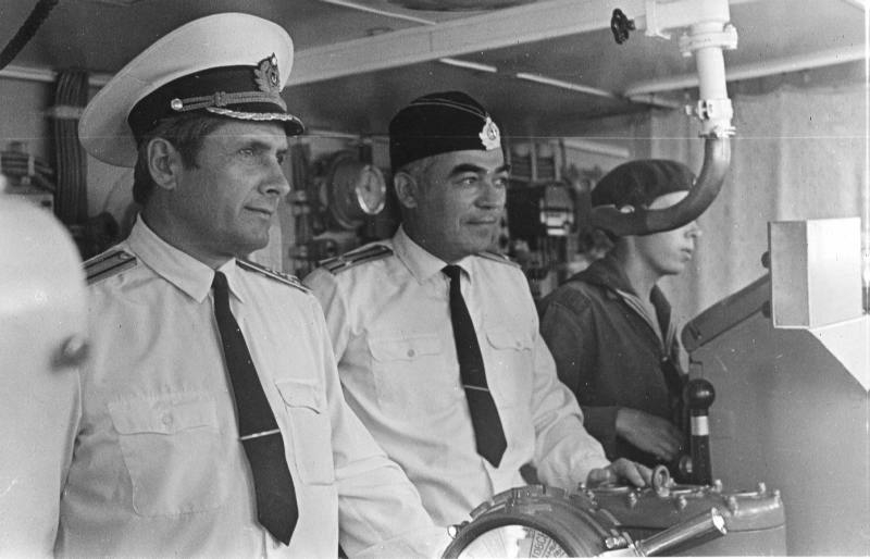 В штурманской рубке Забайкалья. Комбриг капитан 1 ранга Лукаш Д.Т. проверяет прокладки штурмана, 18.04.1974. |