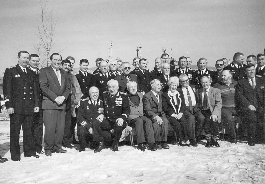 День соединения 1993 год. На 44 причале, справа: комбриг капитан 1 ранга Пивоваров В.К.; капитан 1 ранга Лукаш Д.Т.; капитан 1 ранга Лопатин Э.П.; капитан 1 ранга Шастун А.П,; капитан 1 ранга Дулебенец В.Н. , начальник Разведки ТОФ капитан 1 ранга Майтаков Г.Г.